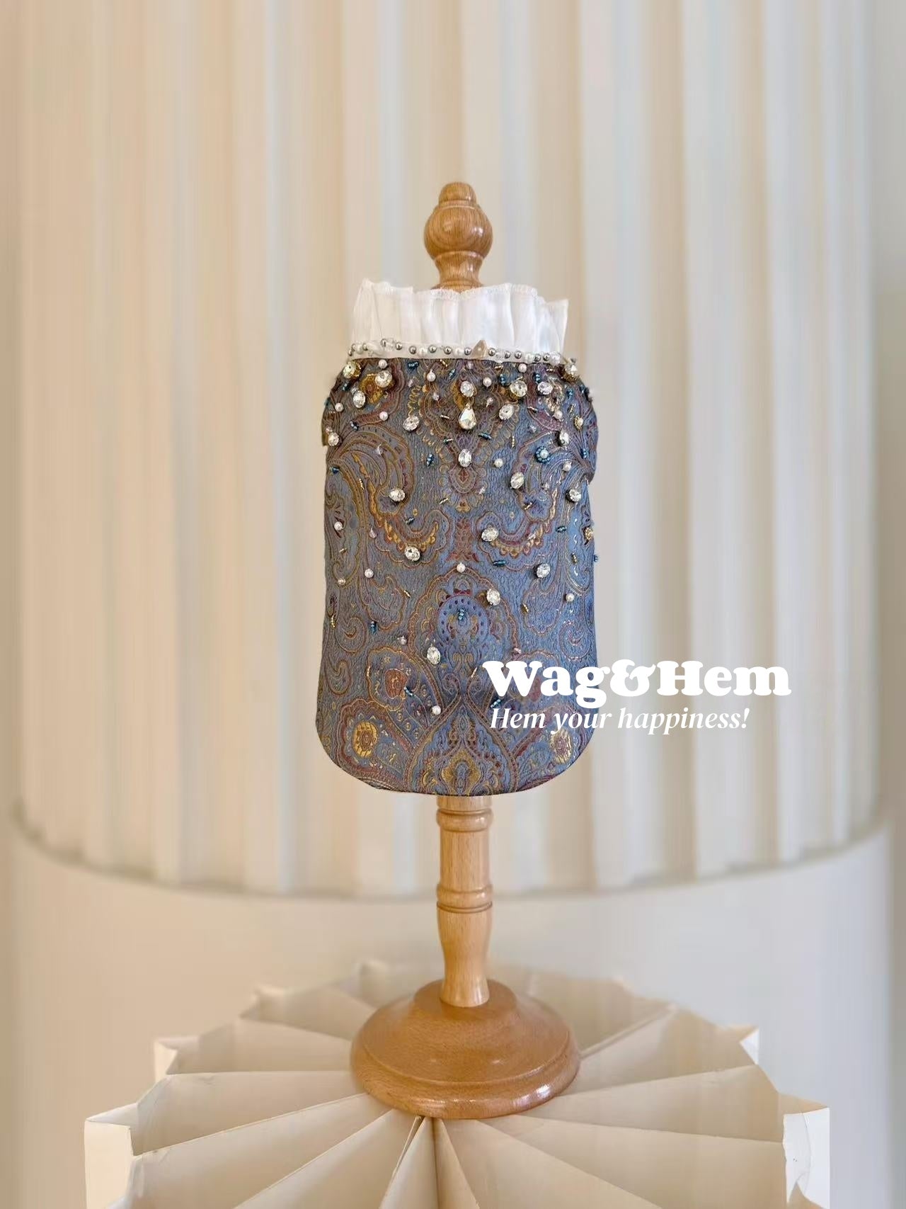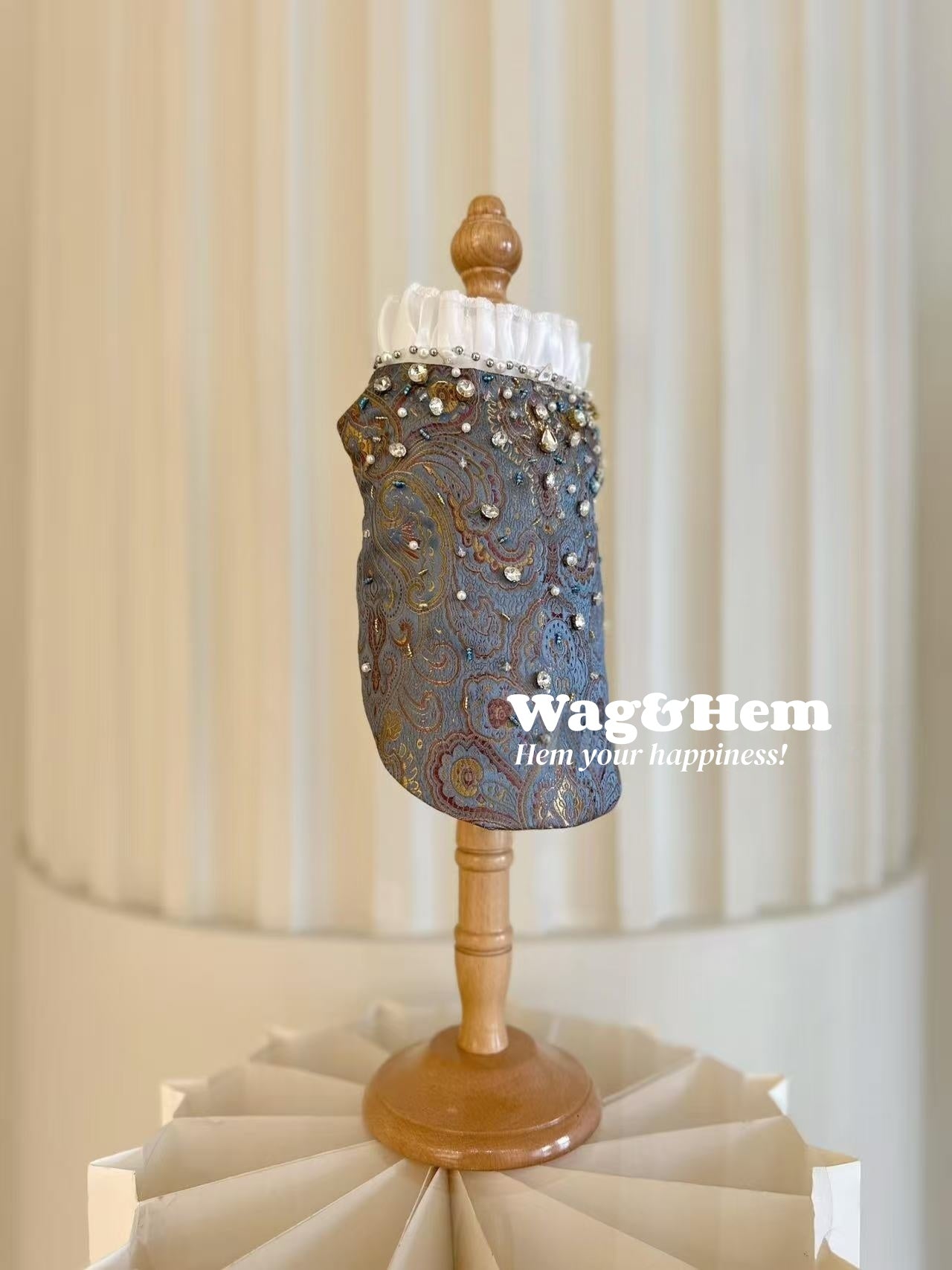 - 選用復古佩利斯(Paisley)提花面料,以深邃藍為主調,綴以手工錯落釘鑽與白色褶邊領,將復古藝術紋理與奢鑽元素精妙融合;提花細節精緻如藝術品,鑽飾在光線下折射璀璨光暈,寵物著身時既飽含復古宮廷的優雅氣韻,又彰顯高定手工的精奢質感,宛如從復古藝術展中走出的萌寵紳士 / 淑女。