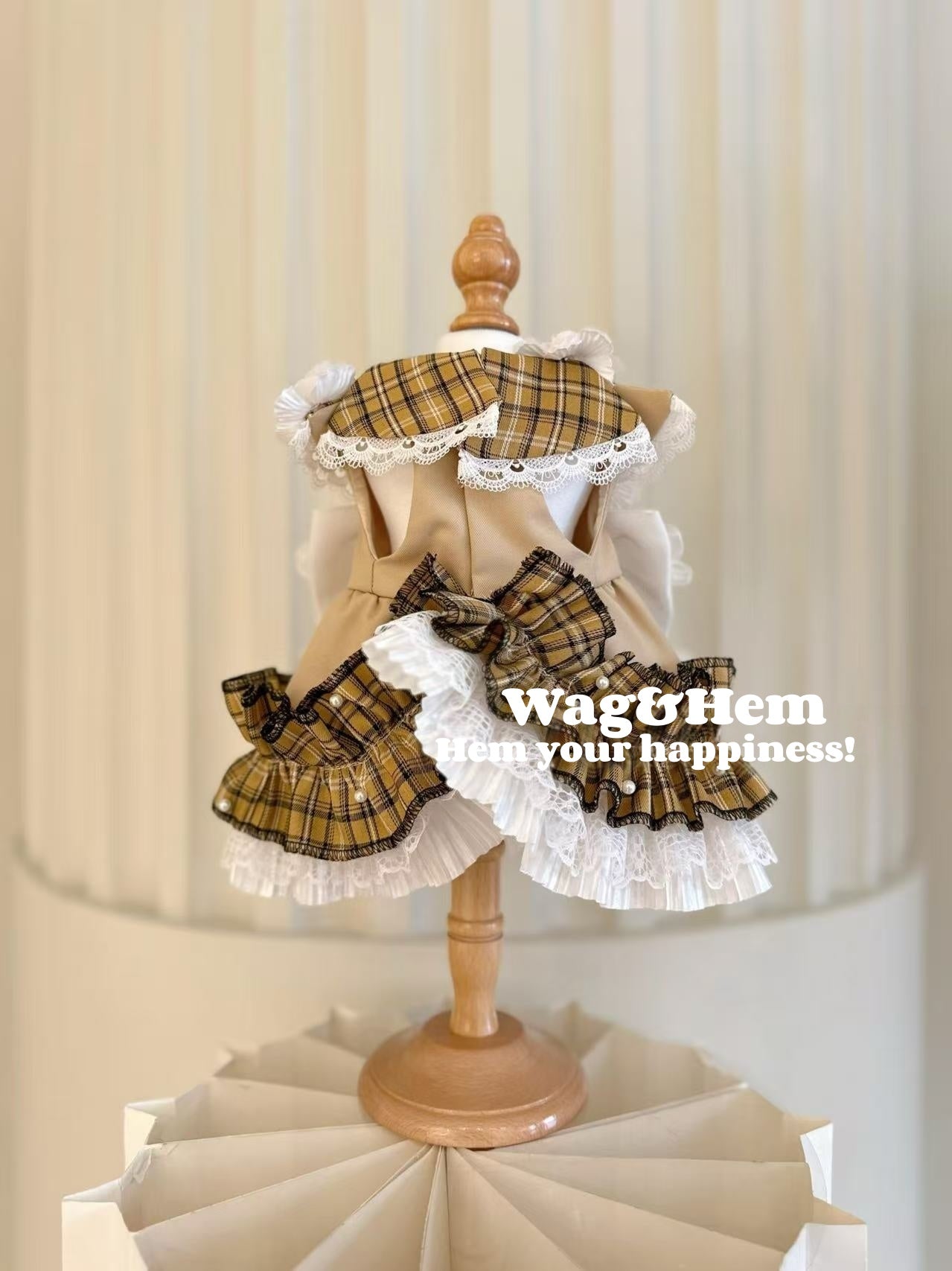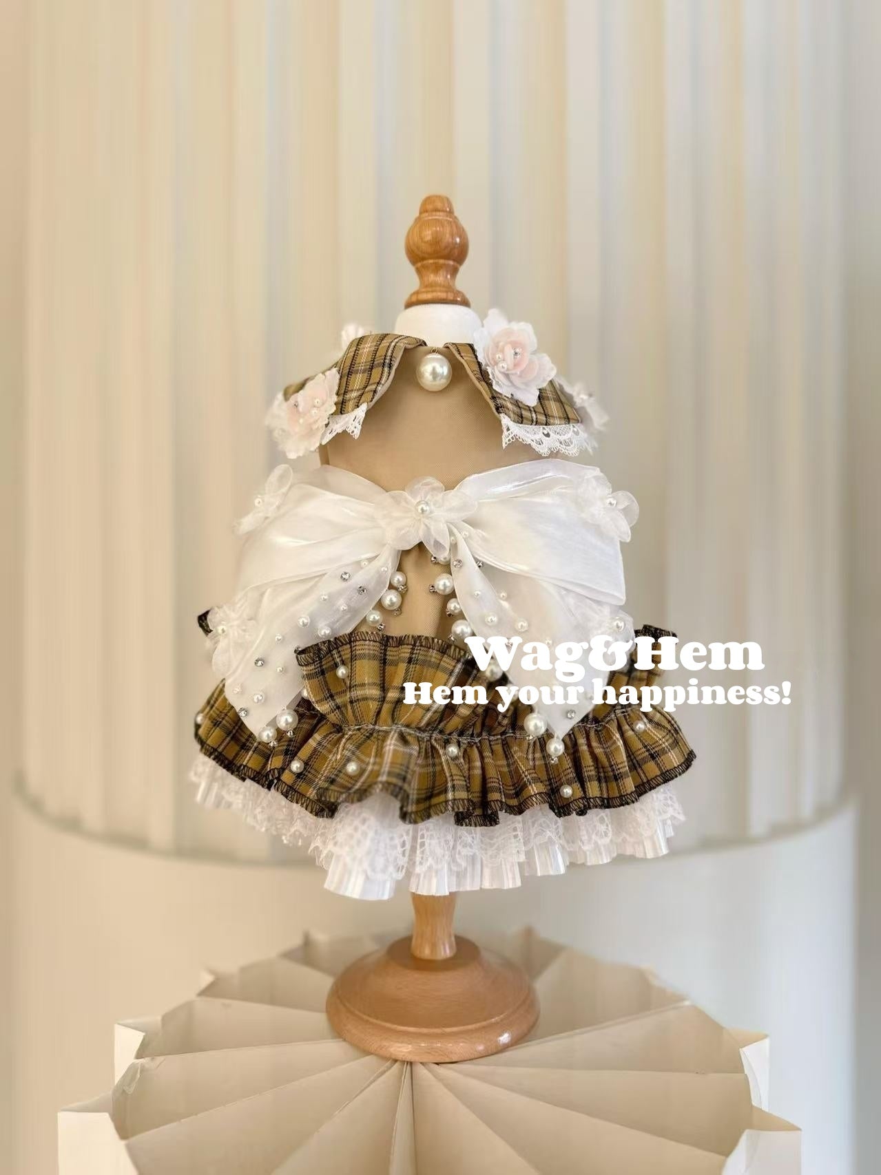 1. 以格紋面料為基底,搭配大尺寸緞面蝴蝶結、手工珠花與蕾絲邊,將學院風的經典格紋與甜美元素精妙融合;格紋層次彰顯復古質感,珍珠與花朵裝飾精緻如藝術品,大蝴蝶結飽滿立體,寵物著身時既像從歐洲童話走出的萌寵貴族,又飽含高定手工的極致細膩,三色(棕格溫潤、藍格清新、綠格雅致)可滿足不同風格偏好。