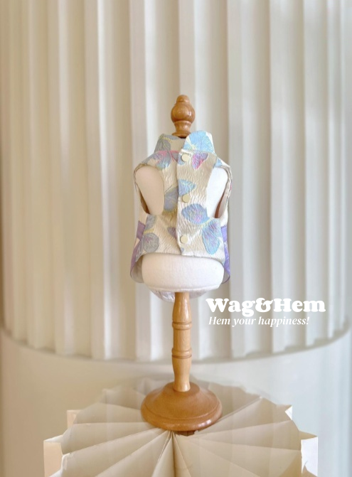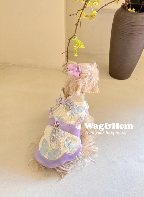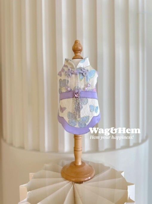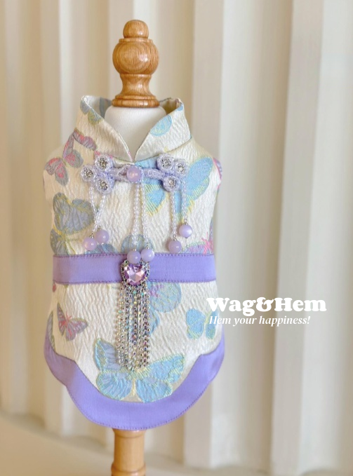 - 以蝴蝶提花綢緞為基底,融合中式立領、盤扣設計,搭配紫珠鏈、鑽石流蘇與腰封,將東方雅緻與幻彩浪漫融於一體;多色蝴蝶紋理錯落有致,珠飾在光線下折射夢幻光澤,寵物著身時既蘊含傳統文化韻味,又綻放靈動仙氣,仿若從東方詩畫中走出的萌寵精靈。