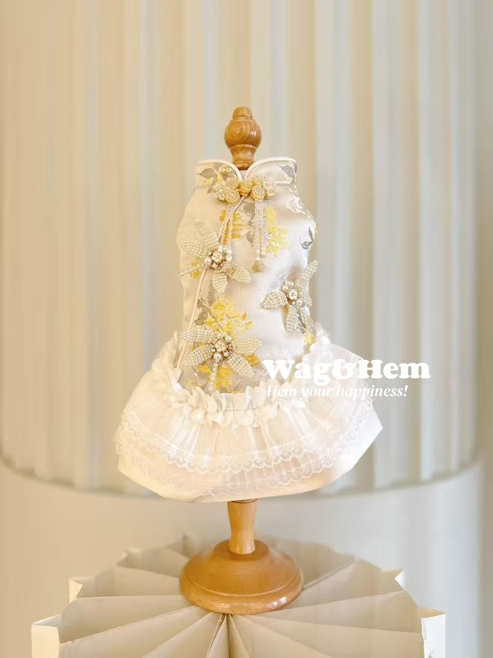 - 以銀白緞面為底,綴以金調提花、手工珠繡花簇與蕾絲蓬裙,將東方旗袍的典雅廓形與夢幻甜美元素精妙融合;提花紋理細膩如錦繡詩篇,珠繡花簇閃耀似星光凝萃,蕾絲裙擺輕盈蓬鬆,寵物著身時既像從古典雅集走出的萌寵仕女,又飽含高定手工的精奢靈氣,輕易成為視覺焦點。