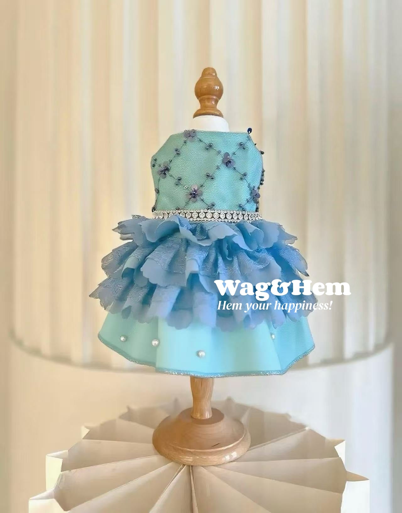 - 以冰藍緞面為基底,綴以手工珠繡小花、水鑽腰封與層疊漸變紗裙,將清新冰藍調與夢幻紗質的層次感精妙融合;珠繡如星點灑落衣身,水鑽腰封閃耀提綴線條,層紗裙擺輕盈似雲朵翻卷,寵物著身時既像從童話仙境走出的萌寵精靈,又飽含高定手工的精緻質感,輕易成為視覺焦點。