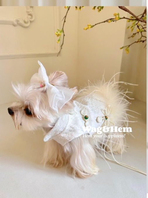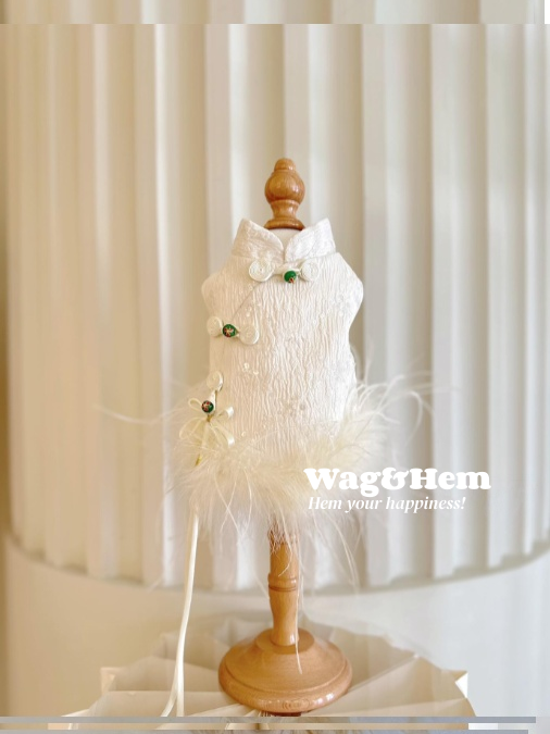選用帶高級肌理的白色面料,質感細膩;羽毛層層手工鋪排,柔軟蓬鬆不刺寵物肌膚;玉扣與寶石純手工定位鑲嵌,每處工藝都藏匠心,不論寵物聚會或寵物婚禮,質感都能完美撐場。 -
