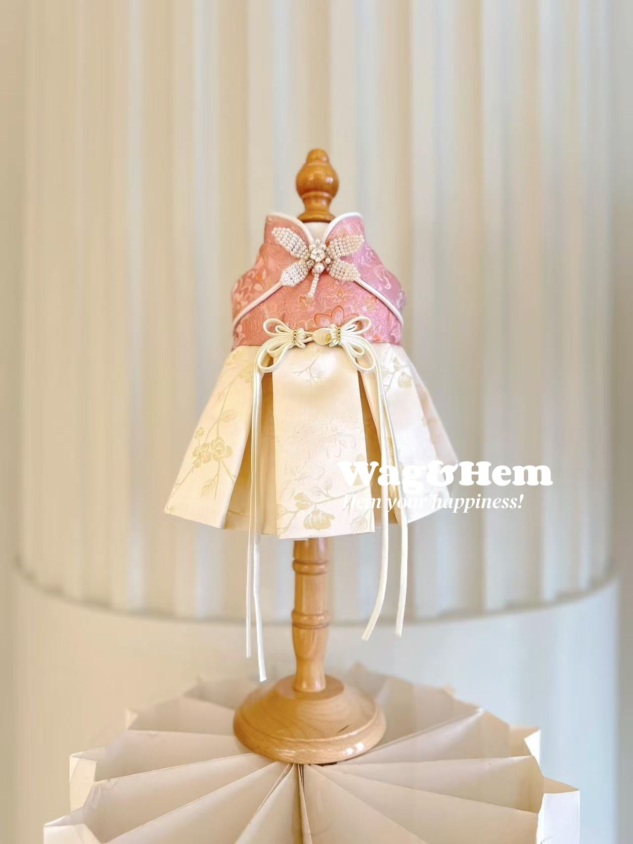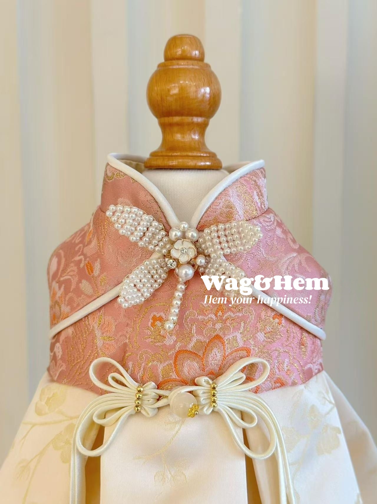 1. 以粉金提花緞面與米白暗紋緞面拼接,綴以手工珍珠蜻蜓飾、緞帶盤扣,將東方旗袍的典雅廓形與自然靈動元素融為一體;提花紋理精細如織錦,珍珠蜻蜓仿若振翅欲飛,盤扣與垂帶點綴出濃郁傳統韻味,寵物著身時既像從古典詩畫走出的萌寵仕女,又飽含高定手工的精奢質感。
