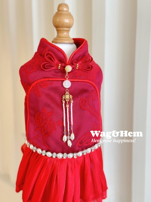 (度身訂製)「紅韻綴珠」高級寵物禮服裙(紅) |寵物婚禮|高端布料【UT系列】