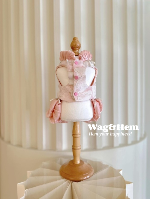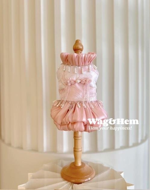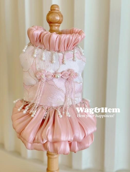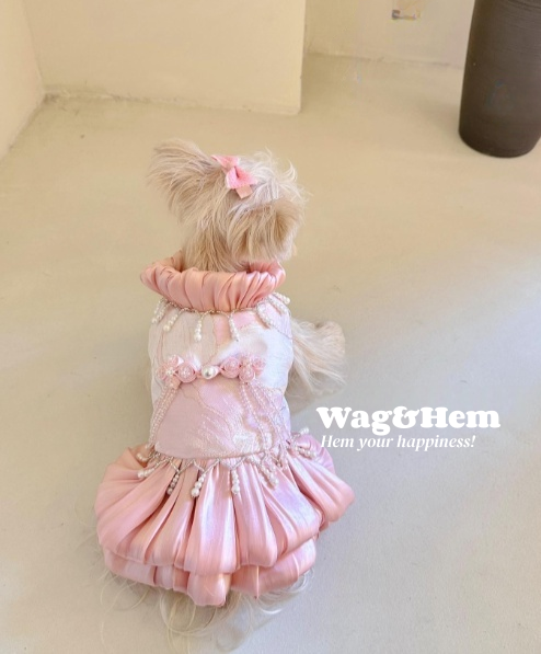 - 以柔粉為主調,提供多色選擇,層疊紗裙、手工珠鏈與立體花飾營造夢幻氛圍,將公主風甜美元素與高定工藝融合;裙身褶皺飽滿立體,珍珠與流蘇隨動輕搖,光線下折射細膩光芒,寵物著身仿若童話萌寵公主,滿載浪漫靈氣。