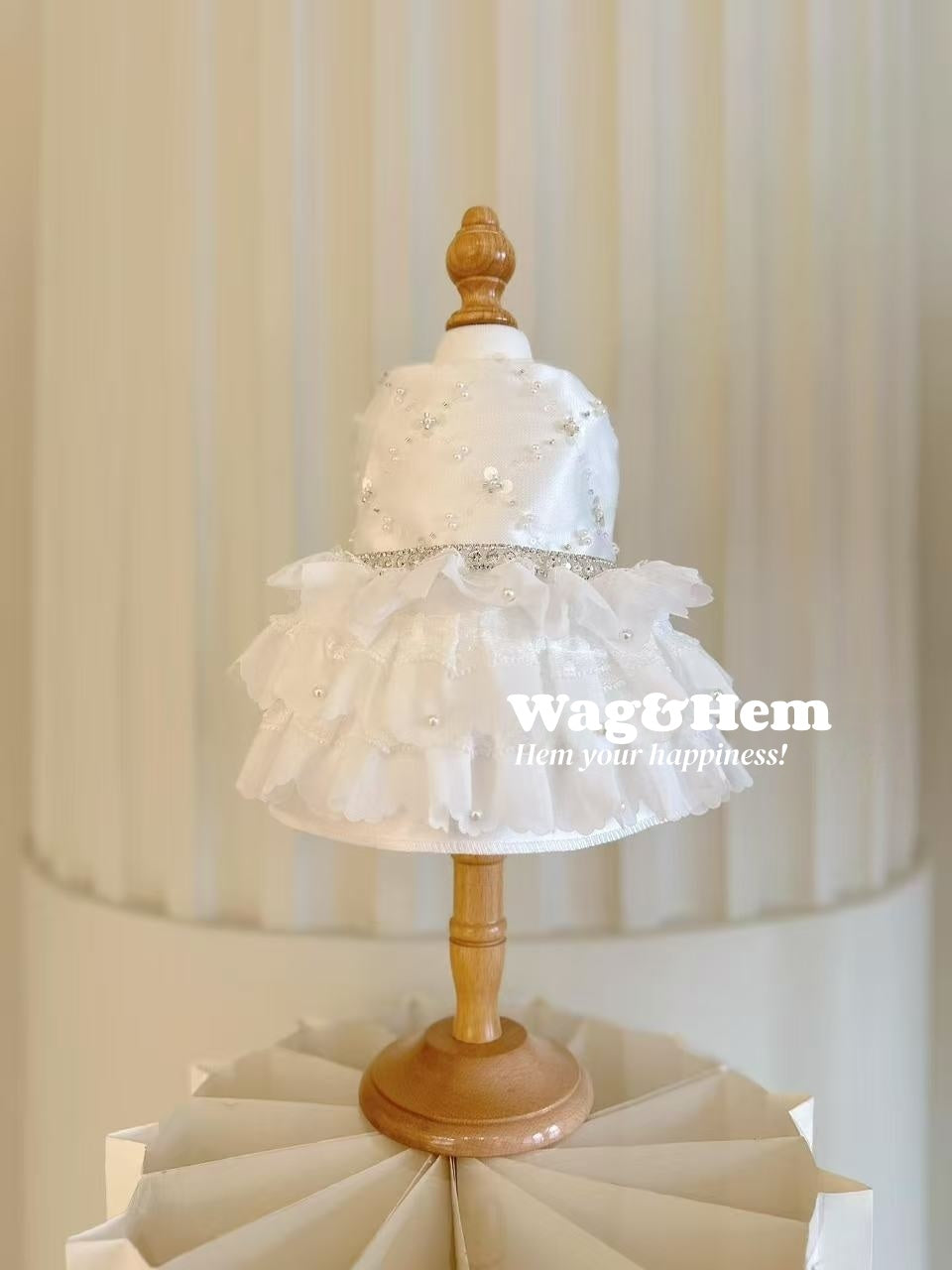 1. 以純白緞面為底,綴以手工珍珠、閃片與層疊花瓣紗裙,搭配水鑽腰帶,將婚紗般的純淨夢幻與高定手工的精奢感融為一體;珍珠與閃片錯落如星子灑落,層紗裙擺輕盈似雲朵,寵物著身時既像童話裡的萌寵仙子,又飽含儀式感滿滿的高級質感,輕易成為視覺焦點。