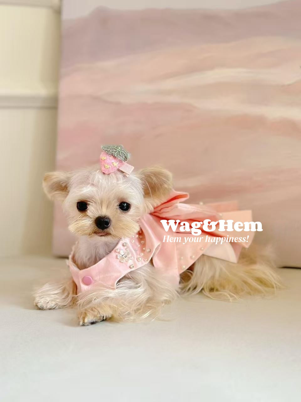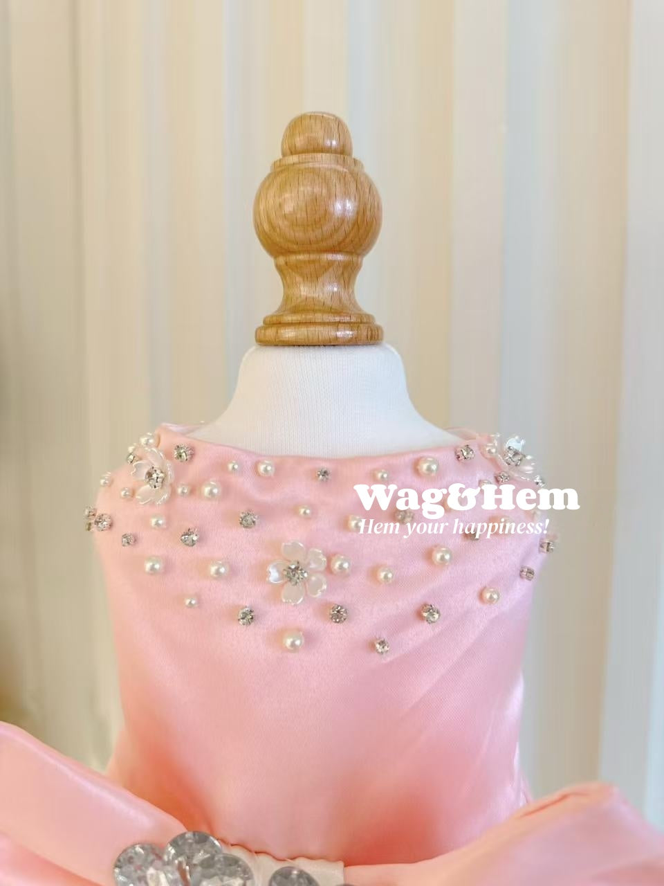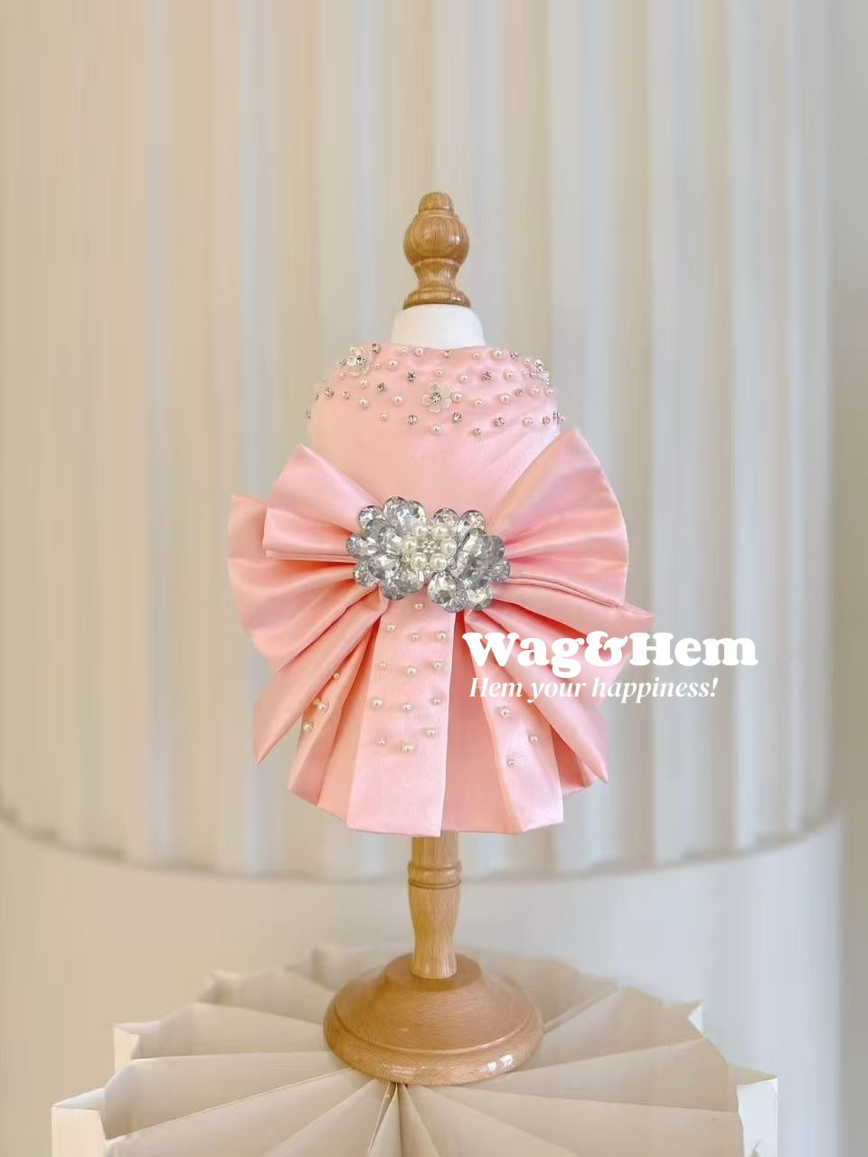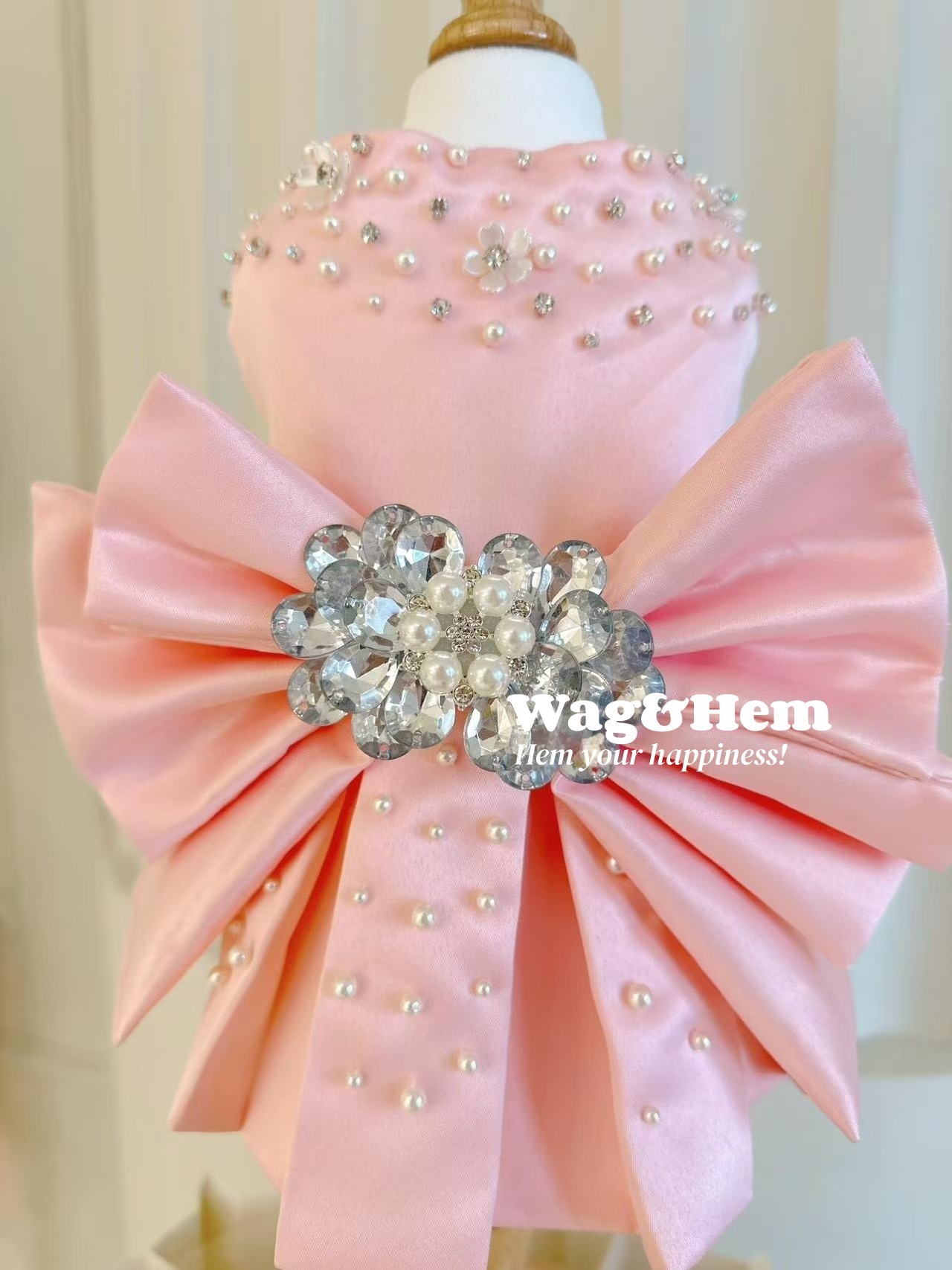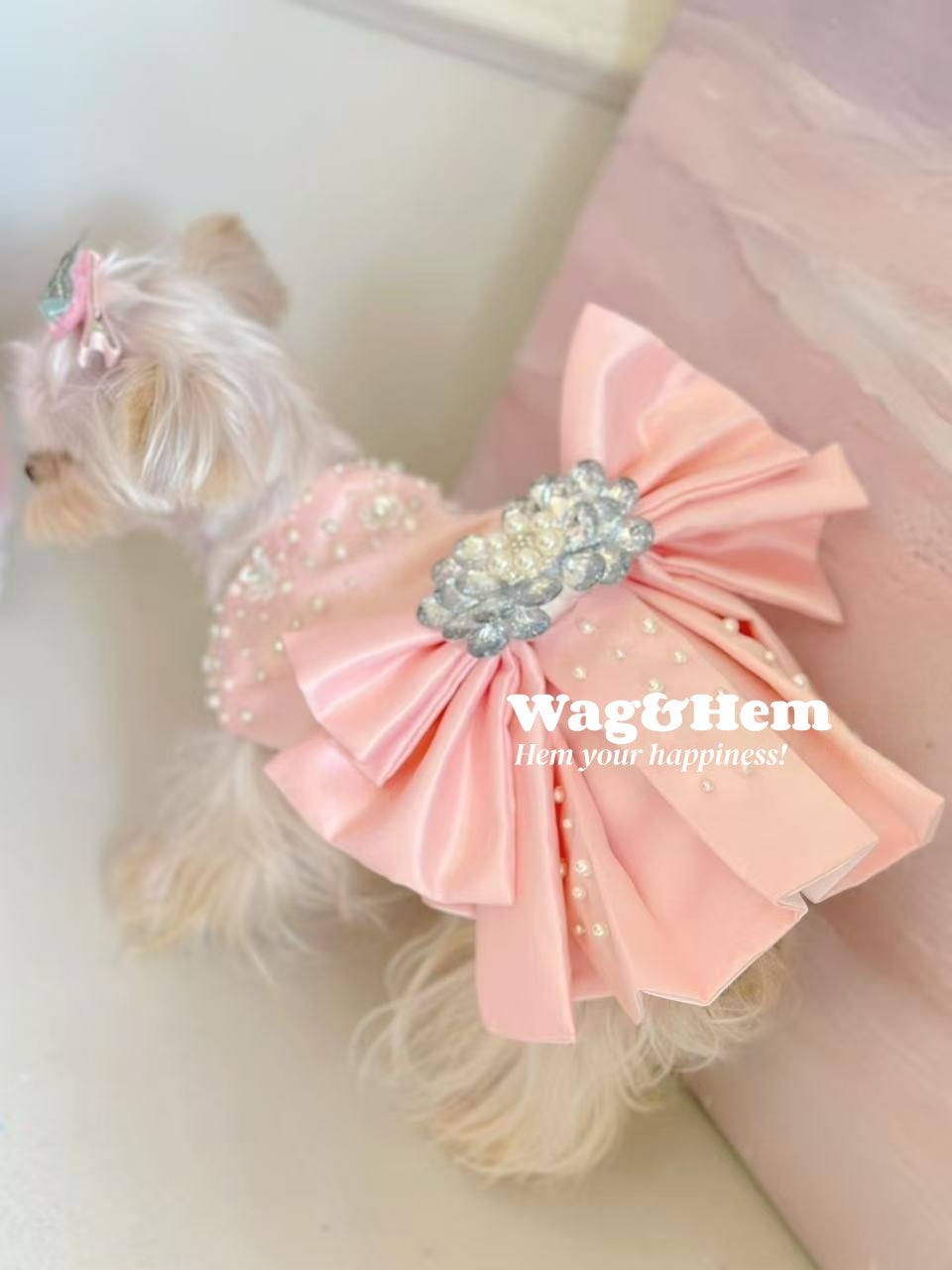 1. 柔らかなピンクのサテンをベースに、大きなサテンリボン、手作業で施されたラインストーンの花飾りとパールをあしらい、プリンセス風の甘く夢のような雰囲気と高級オートクチュールのジュエリーの豪華さを見事に融合。リボンはふっくらと立体的で蝶の羽のように広がり、ラインストーンとパールが輝きを放ち、ペットが身に着けるとまるでおとぎ話のかわいいプリンセスのようで、最高級の手作りオーダーメイドの繊細な質感も感じられ、視線を集めること間違いなしです。