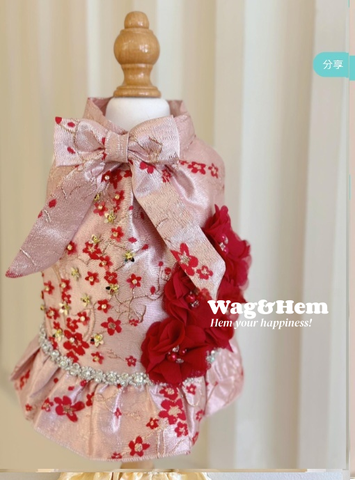 - 桃色のサテンに紅梅の刺繍とスワロフスキーが輝き、大きなリボンが上品で可愛らしいアクセントに。東洋の繊細さとロマンチックな華やかさを兼ね備え、ペットがまるで貴族の小さなプリンセスのように見えます。
