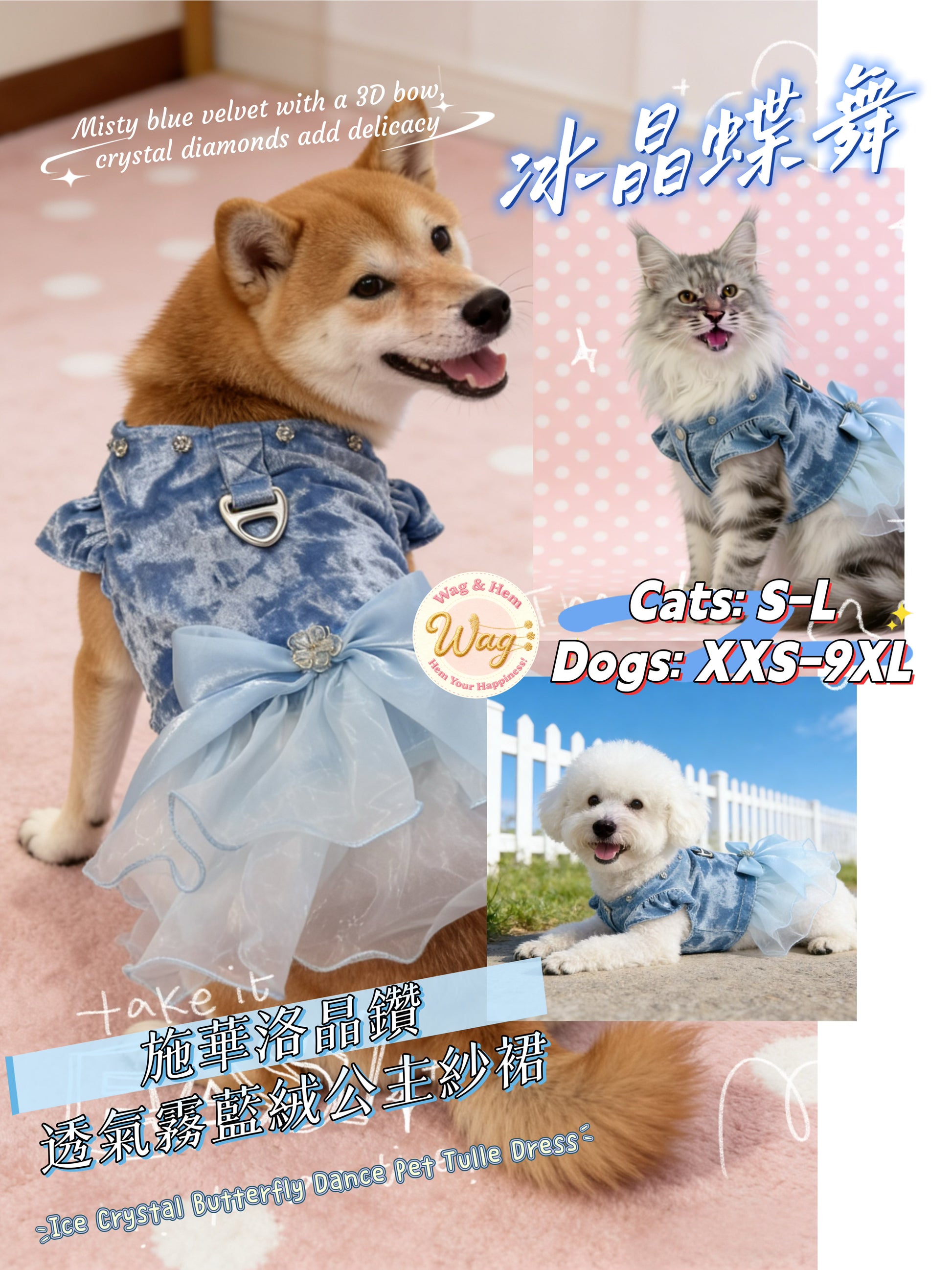 【冰晶蝶舞】施華洛晶鑽透氣霧藍絨公主紗裙|寵物優雅禮服【WH系列】