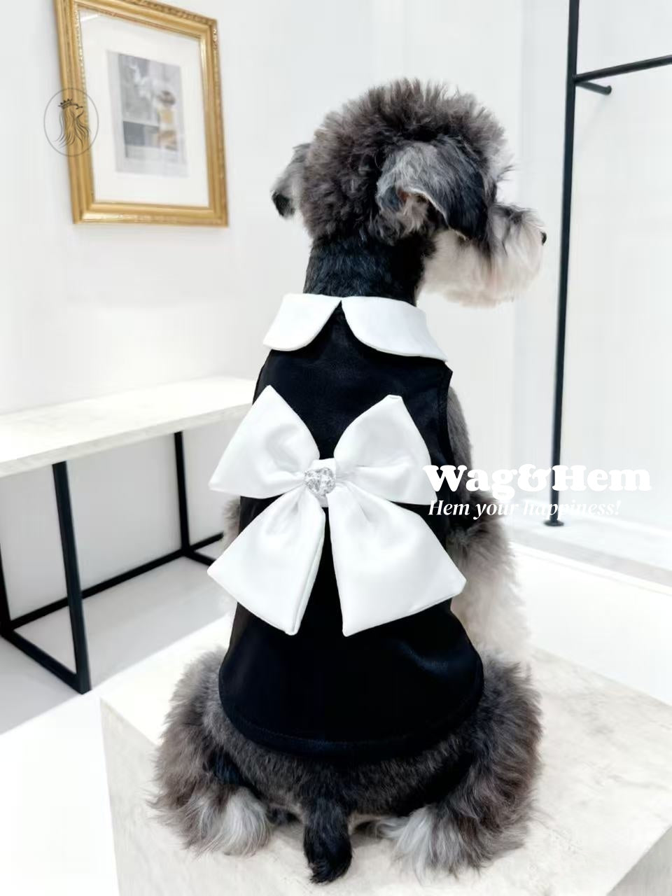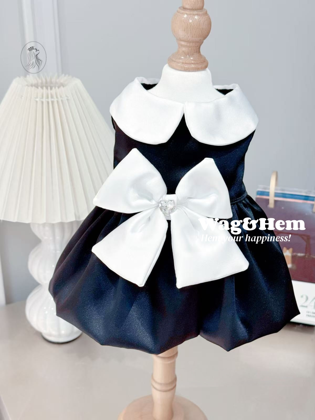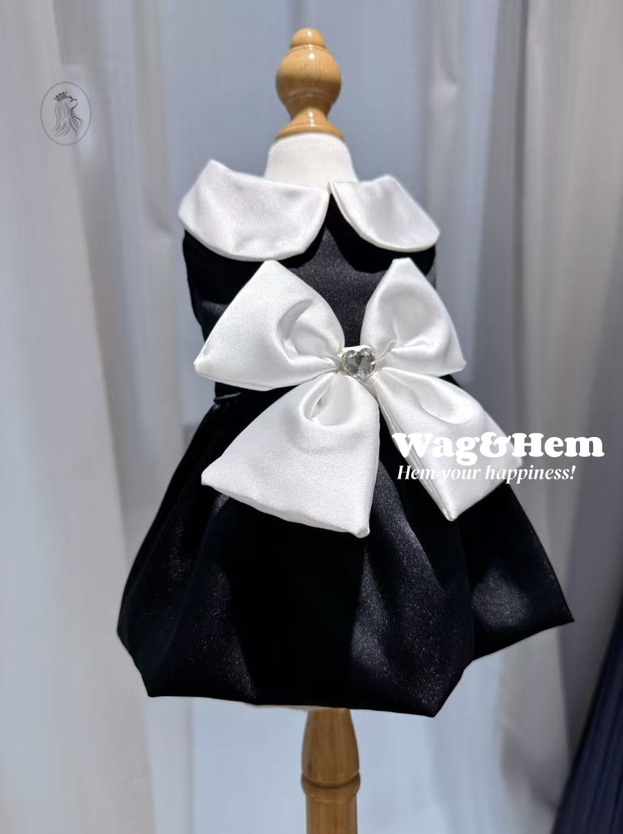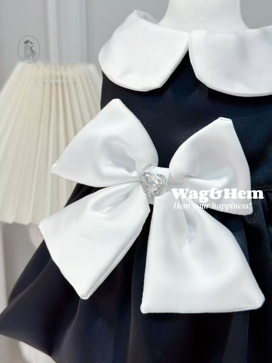 選用頂級黑緞面料,搭配潔白彼得潘領與鑲鑽蝴蝶結,展現經典黑白配的永恆時尚
