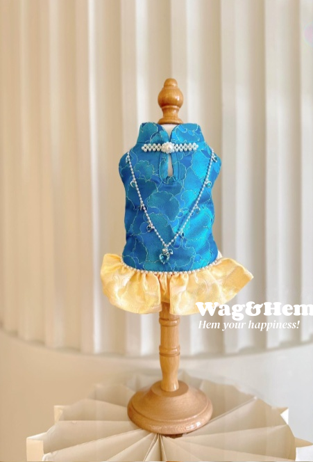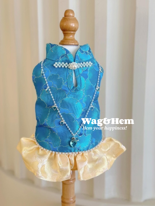1. 藍金配色融合中式旗袍立領與奢華珍珠、心形墜飾,既符合東方典雅感,又契合浪漫奢華風,寵物著身瞬顯高級氣場。