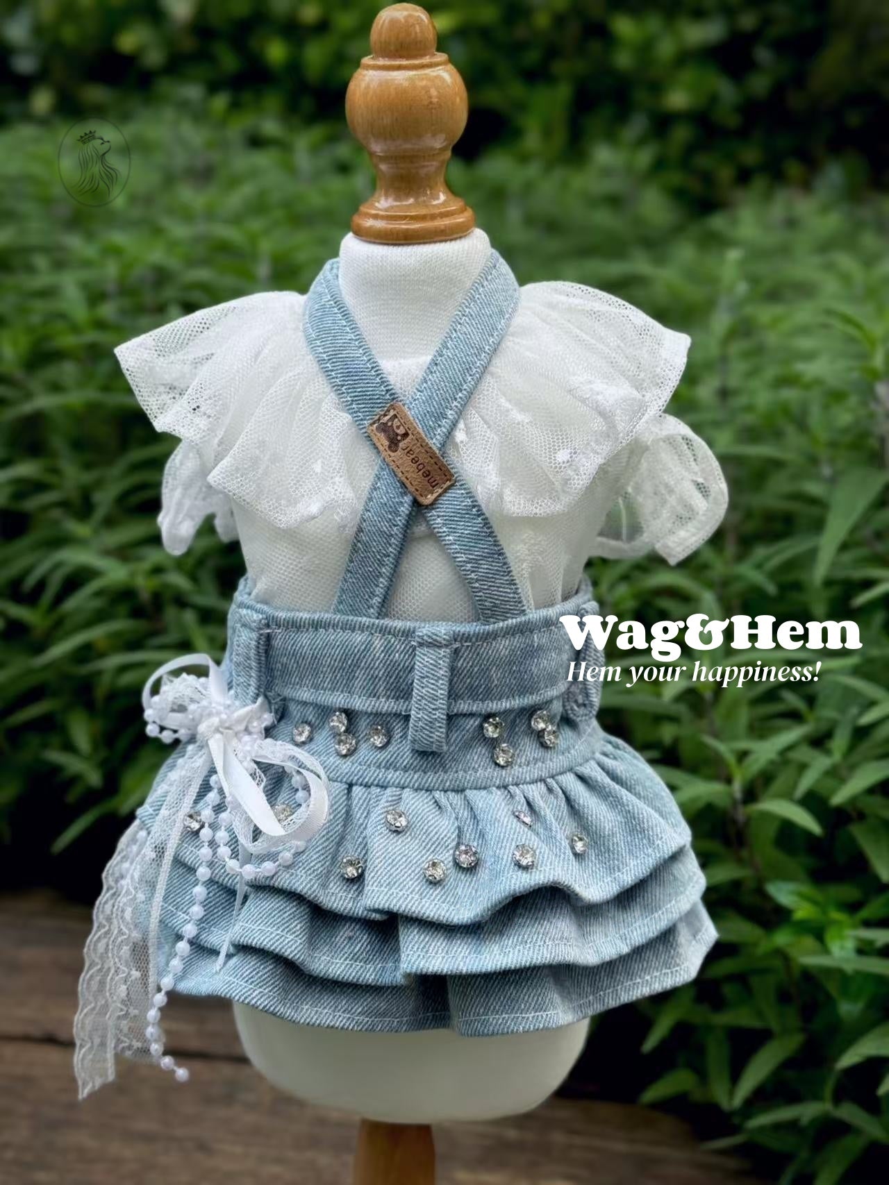 內搭白色小花蕾絲衫,外罩淺藍牛仔吊帶裙,結合閃鑽與蕾絲蝴蝶結,完美平衡甜美與率性