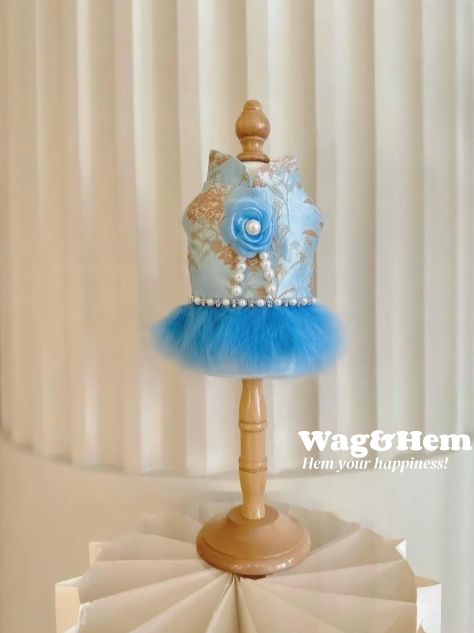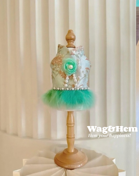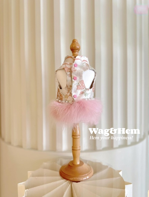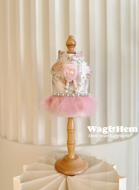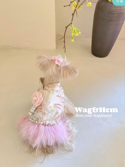 1. 以綴滿花葉提花的緞面為底,融合中式立領設計,搭配手工立體粉花、珍珠鏈與蓬鬆粉羽裙擺,將東方典雅與浪漫柔美元素精妙糅合;多色選項可滿足不同審美偏好,讓寵物著身時既蘊含傳統韻味,又綻放甜寵靈氣,仿若從藝術畫卷中走出的萌趣貴族。