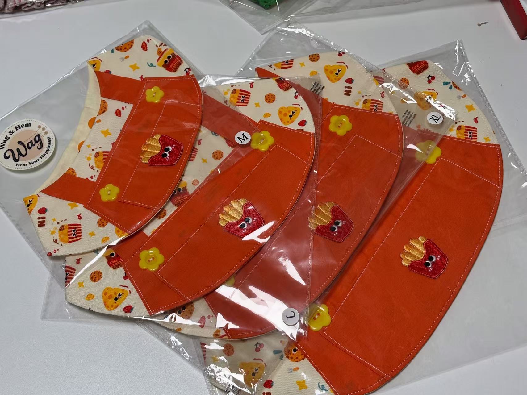 1. 以活力橙色為主調,搭配薯條、爆米花等美食卡通印花,綴以立體薯條造型繡花與黃花按扣,將薯條主題的童趣氛圍與寵物實用穿搭融合;薯條元素鮮明吸睛,立體繡花萌趣可愛,黃花按扣牢固且增添造型感,圍兜版型貼合寵物身形,進食防髒同時營造 “美食小達人” 的歡樂感。
