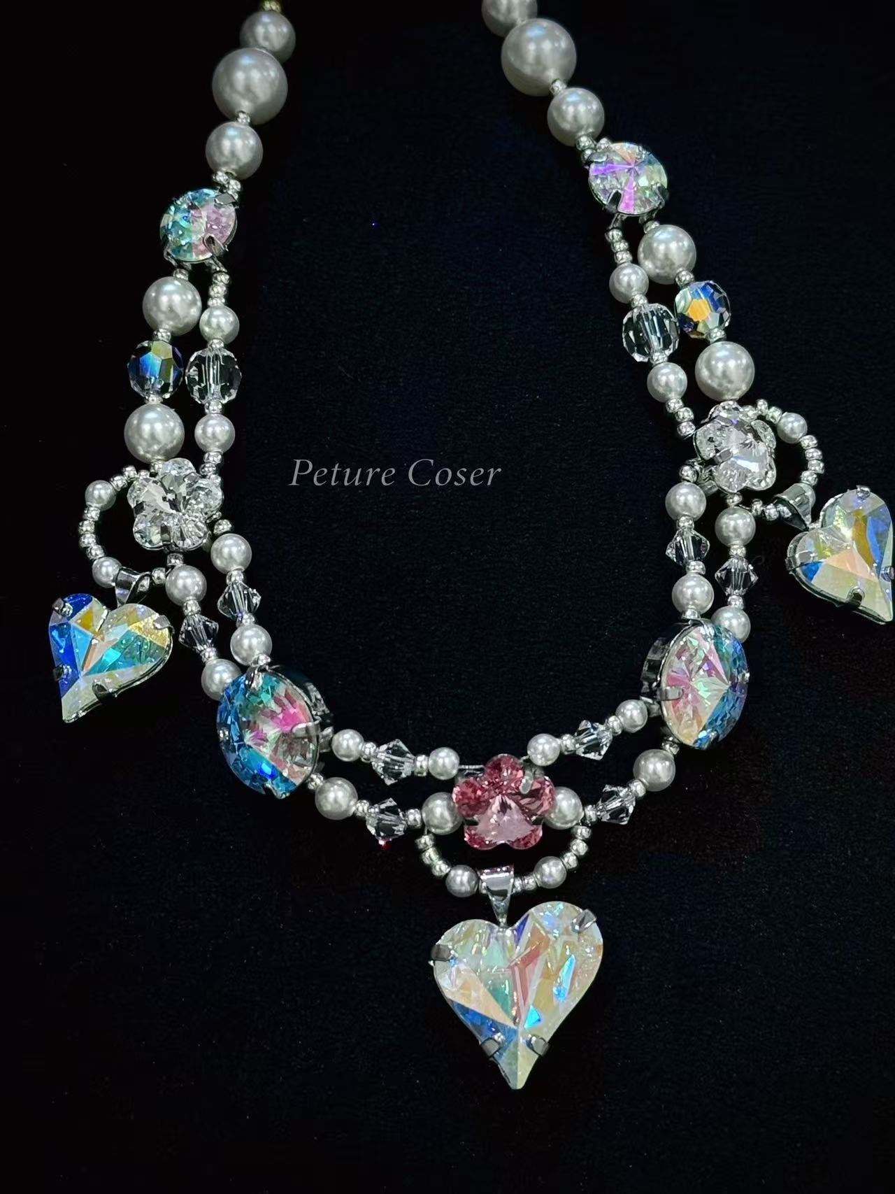 採用施華洛世奇幻彩水晶與日本米珠,經專業切割與手工編織,光線下折射出絢麗虹彩。