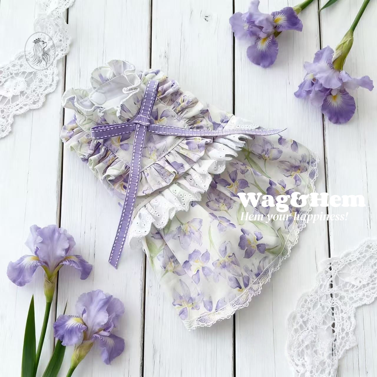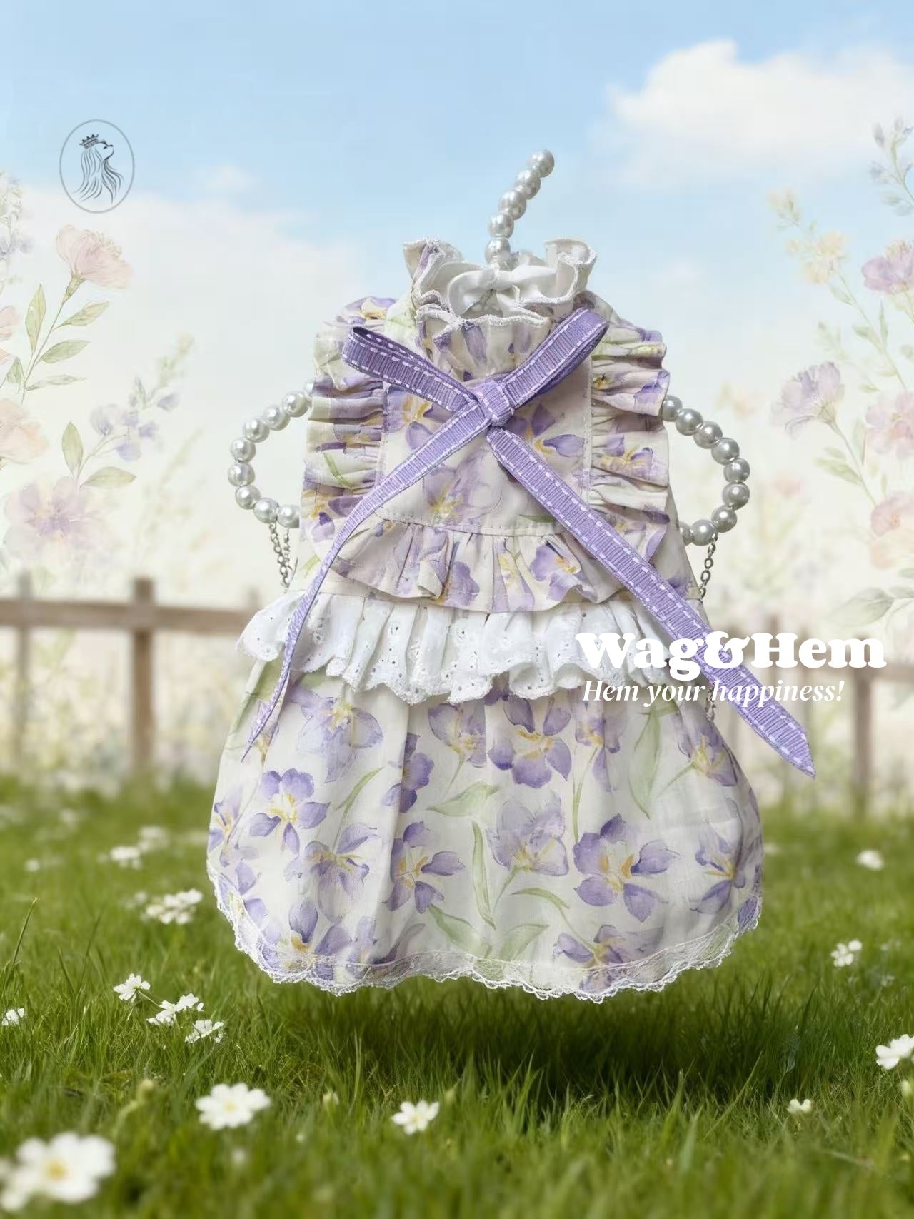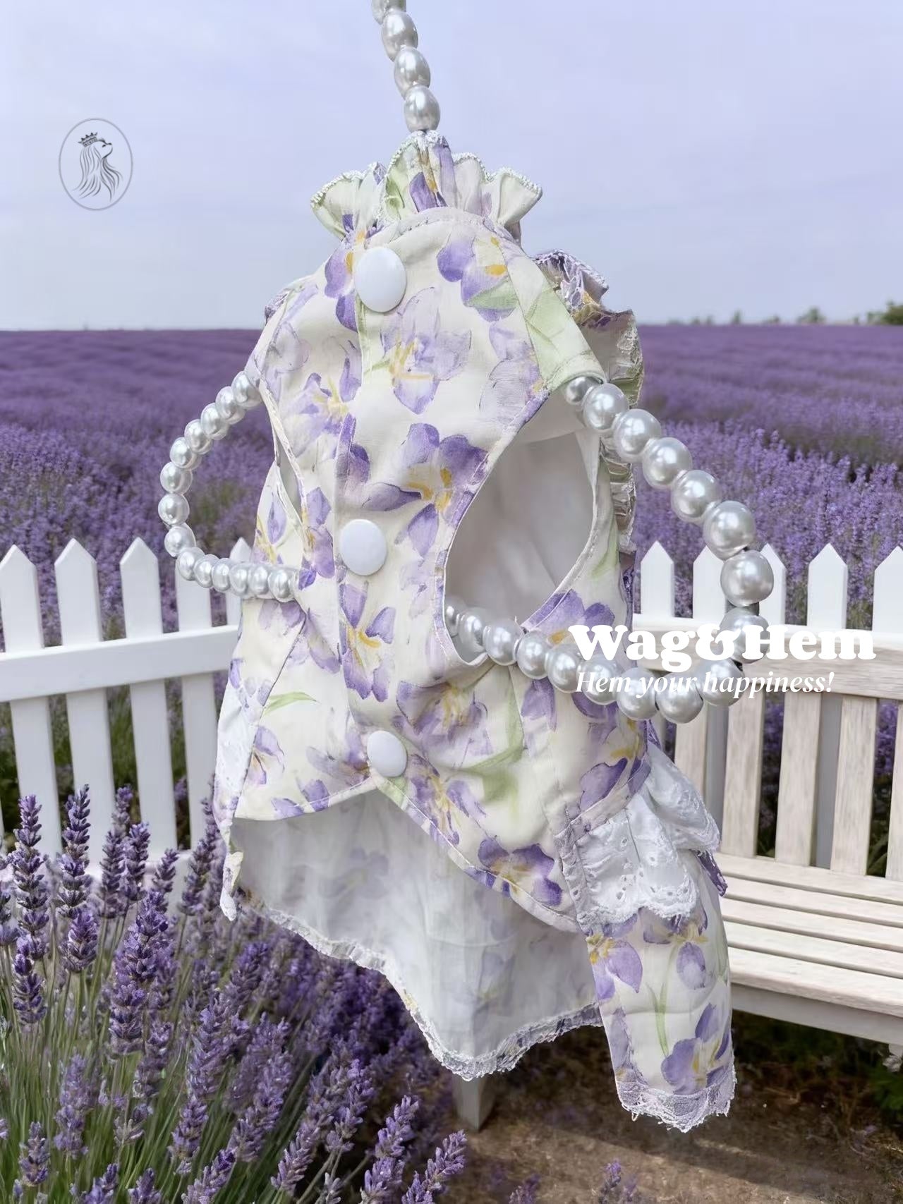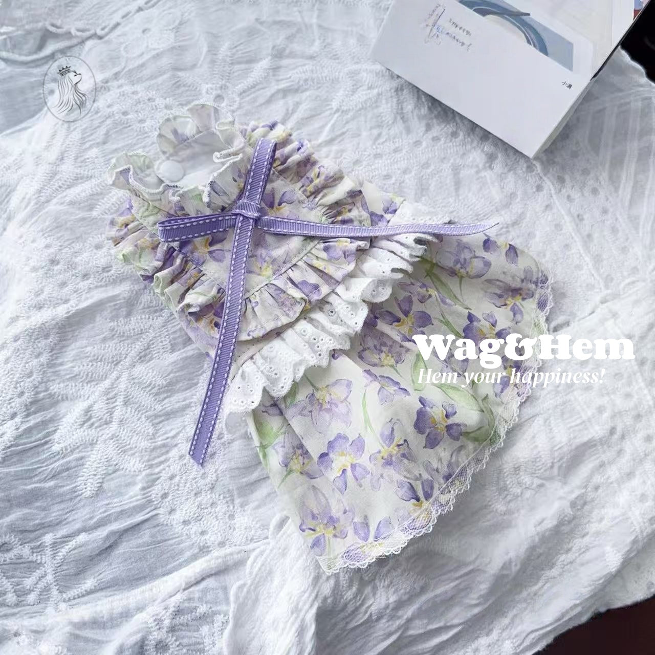 選用水彩風紫羅蘭印花面料,搭配層疊白色蕾絲與紫色緞帶蝴蝶結,完美重現薰衣草田的夢幻氛圍