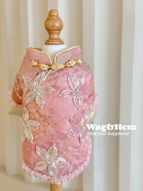 1. 選用粉嫩緞面作為基底,輔以精緻珠片手工繡花,金屬盤扣與荷葉邊細節點綴其間,將東方旗袍的典雅韻味與奢華裝飾精妙融合,使寵物著身時既飽含傳統美學氣質,又閃耀著高級訂製的精緻感,宛如從古典藝術場景中走出的萌寵貴族。