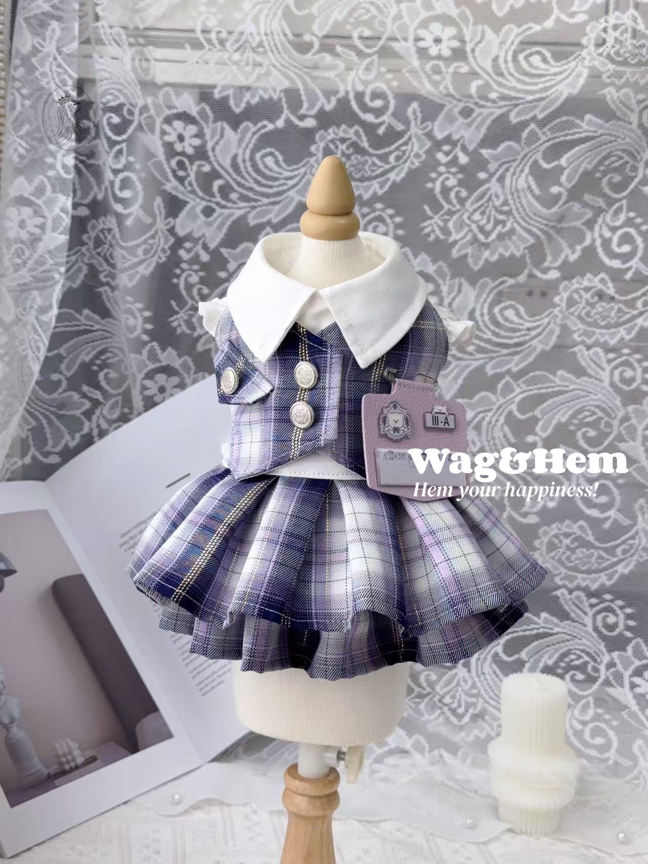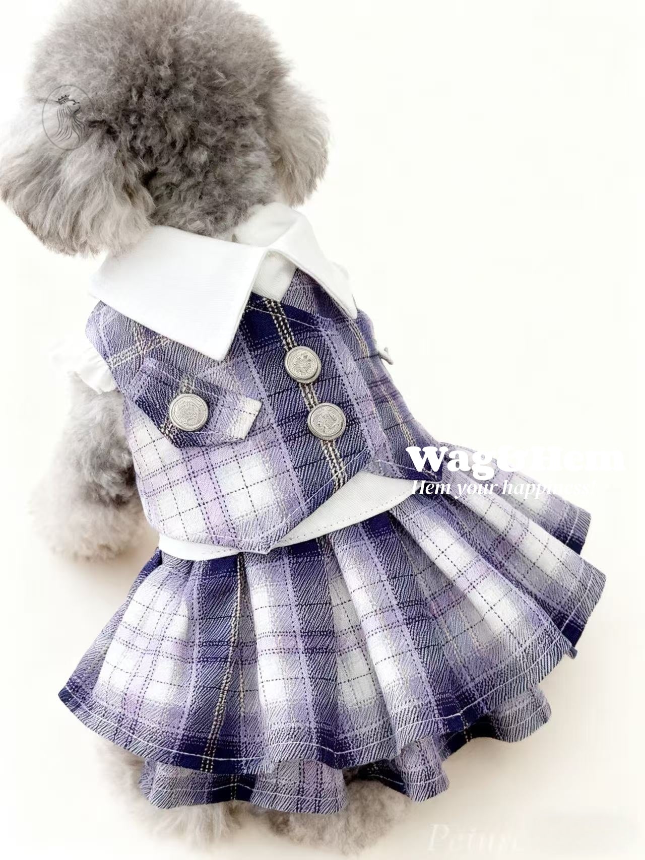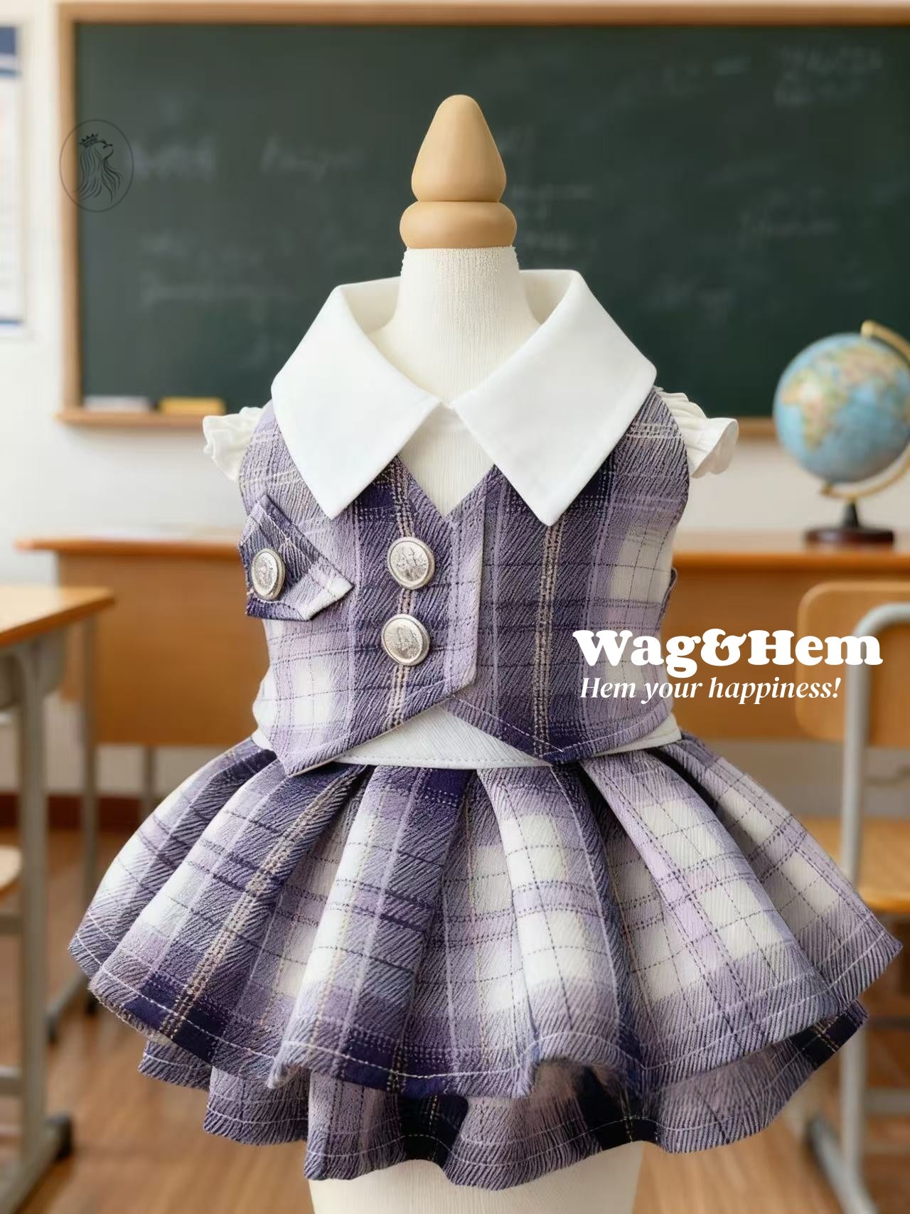 選用夢幻紫格紋面料,搭配潔白彼得潘領與銀色復古鈕扣,背心與百褶裙組合完美重現經典JK風格