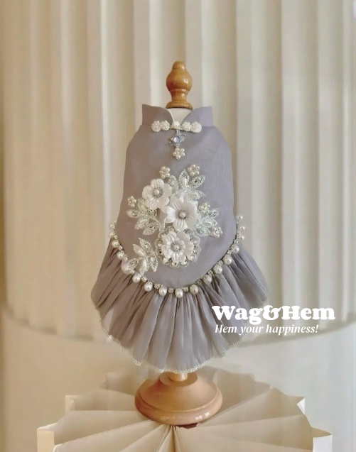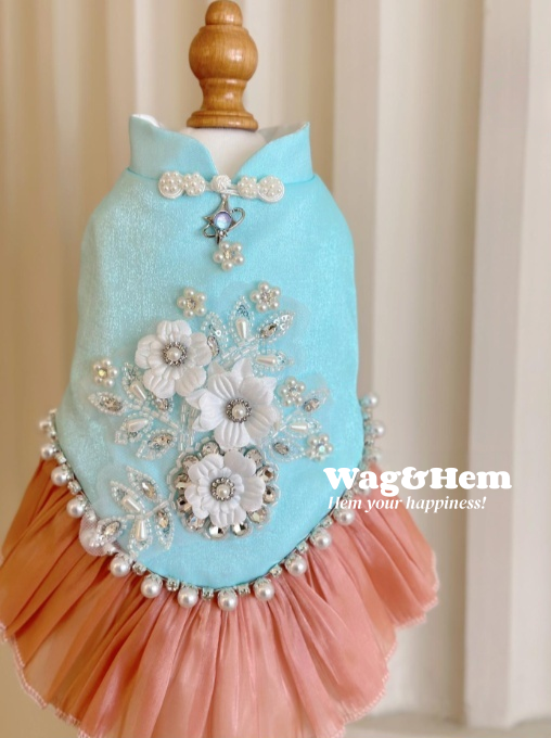 1. 採用撞色設計,中式立領搭配珍珠盤扣、星空吊墜,將東方典雅與幻彩浪漫融於一體;手工綴飾的立體花朵、閃鑽與珍珠層次豐富,光線下折射出夢幻光澤,賦予寵物如精靈般的靈動氣質,輕鬆成為視覺焦點。
