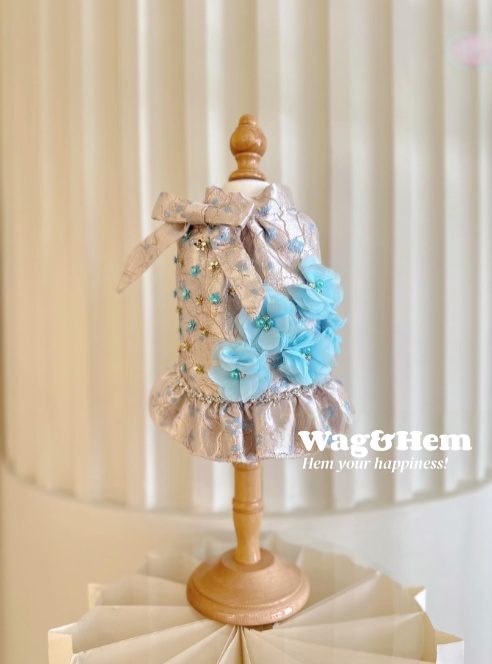 - 銀色緞面綴藍花與閃片,大蝴蝶結增添精緻感,既奢華精緻又浪漫花漾,寵物穿著瞬間成為聚會焦點。