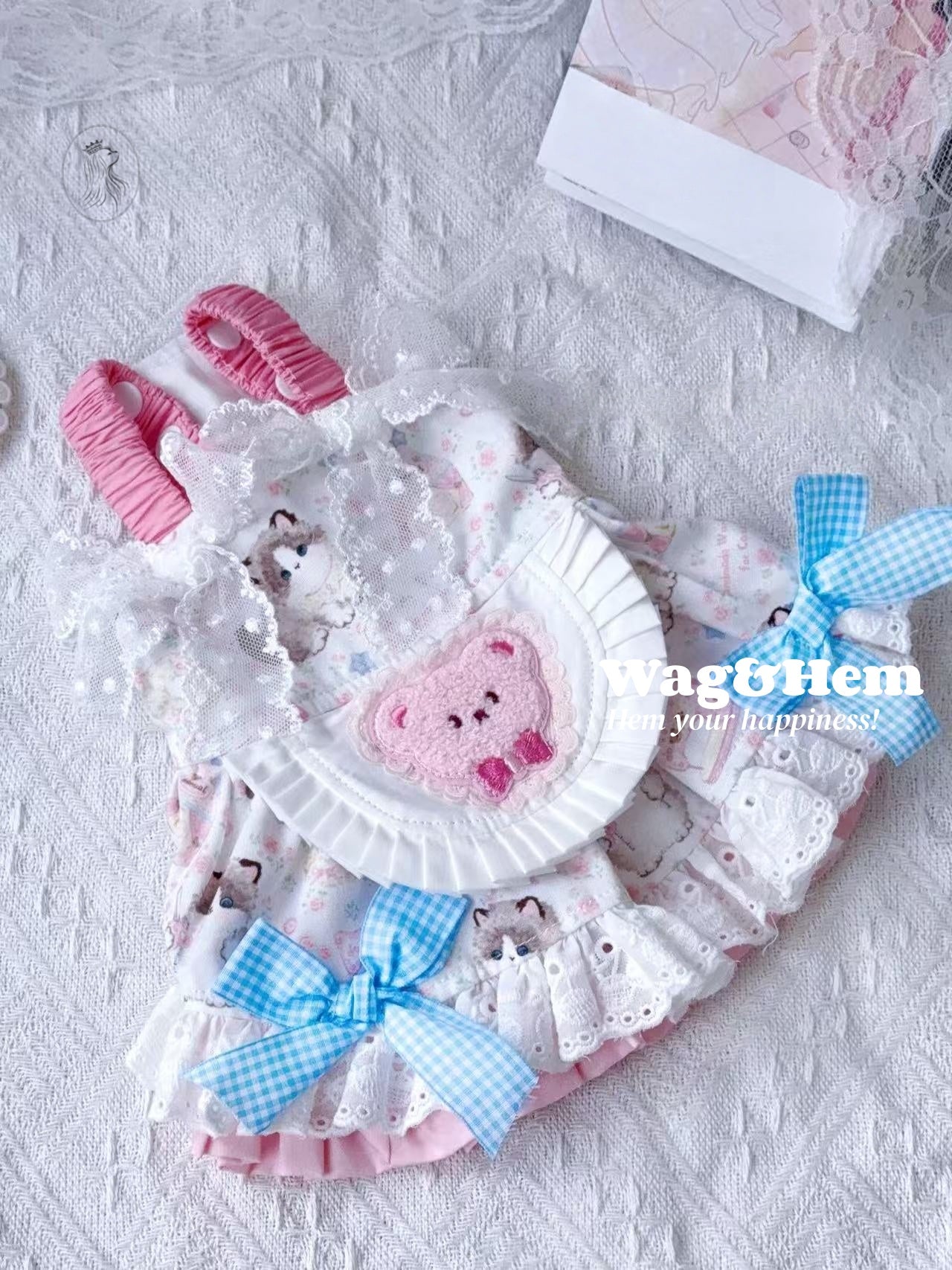 選用滿版童趣印花布料,搭配粉紅小熊貼布、藍格紋蝴蝶結與精緻蕾絲,完美呈現夢幻甜系美學