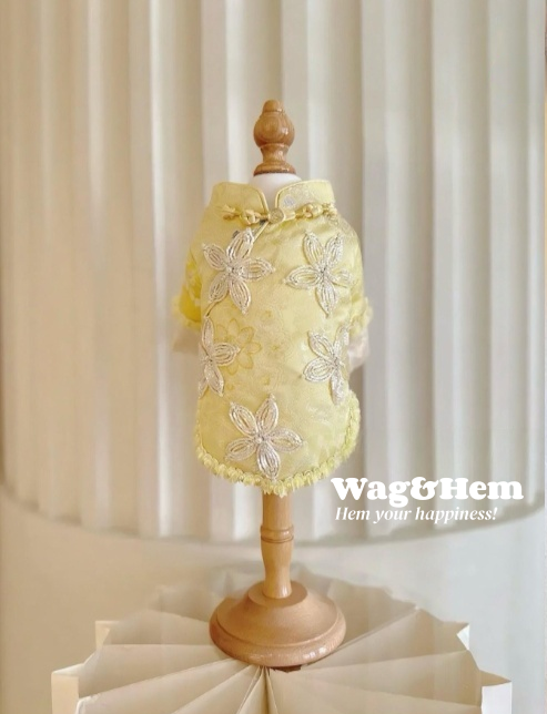- 選用淡黃緞面作為基底,輔以精緻珠片手工繡花,金屬盤扣與荷葉邊細節點綴其間,將東方旗袍的典雅韻味與奢華裝飾精妙融合,使寵物著身時既飽含傳統美學氣質,又閃耀著高級訂製的精緻感,宛如從古典藝術場景中走出的萌寵貴族。