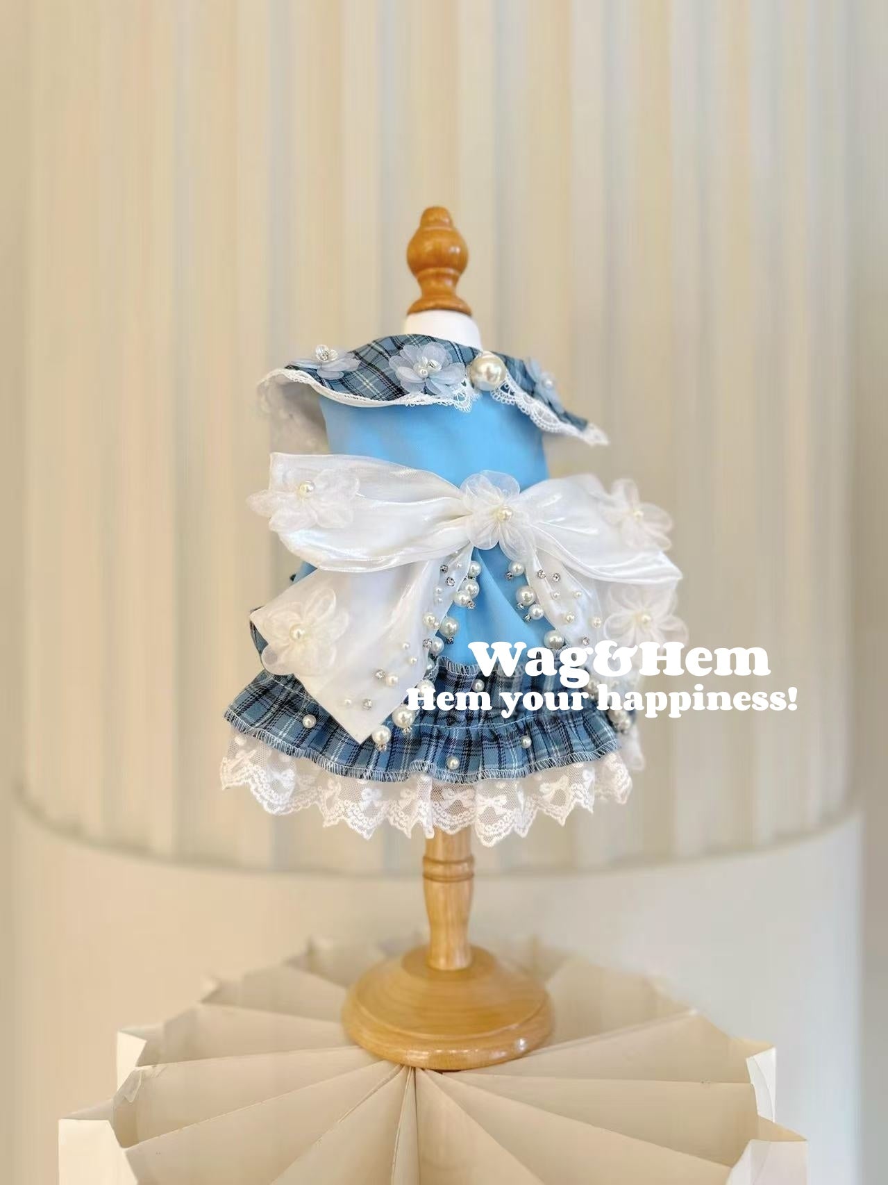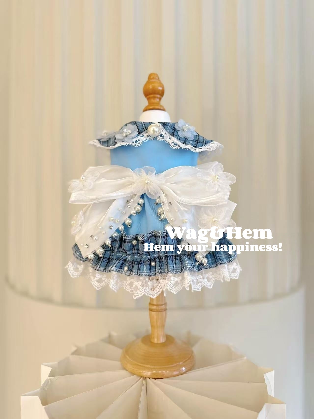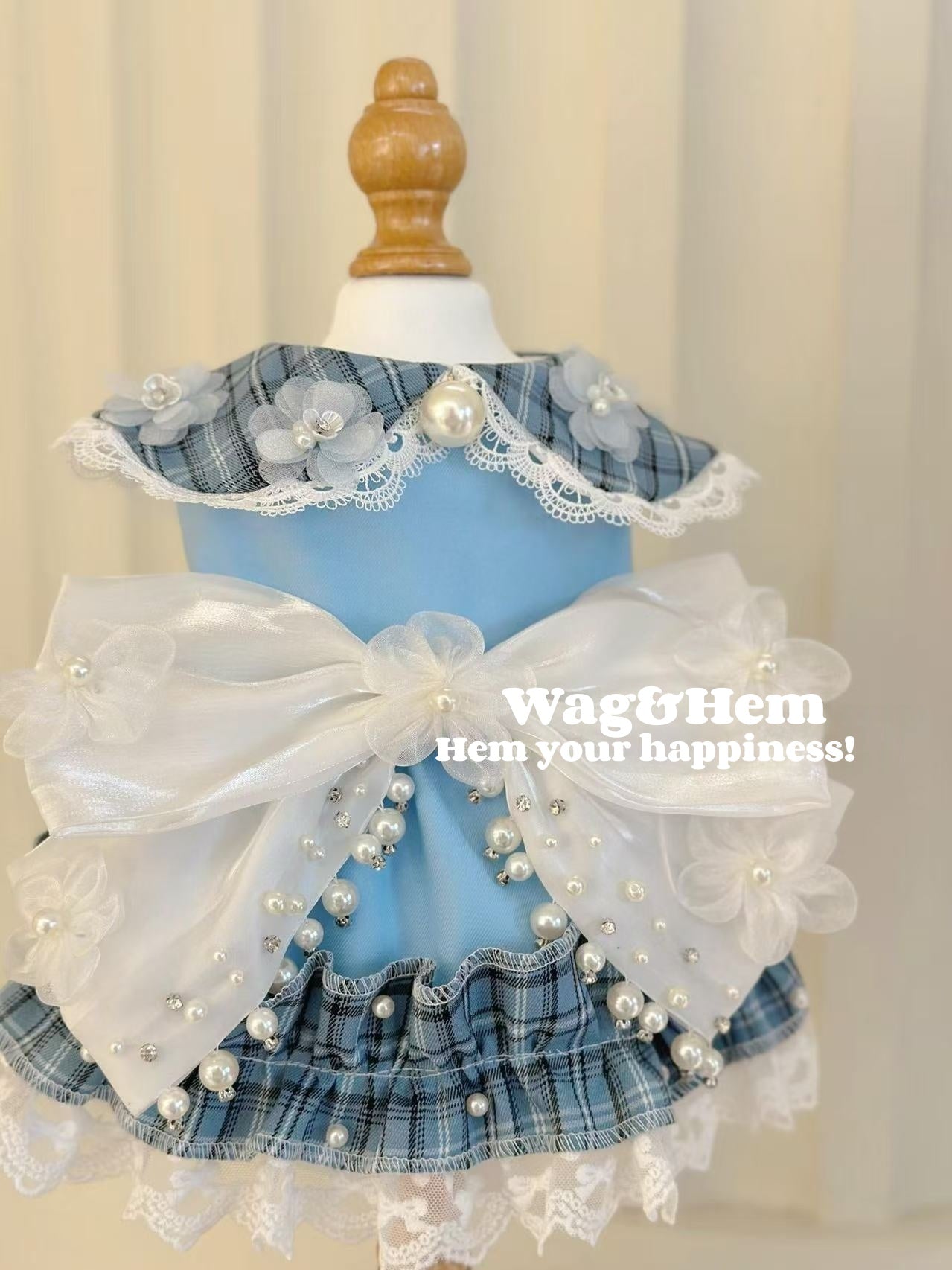 (度身訂製)「格紋珠花」高級多色禮服(藍)|寵物婚禮|高端布料【UT系列】