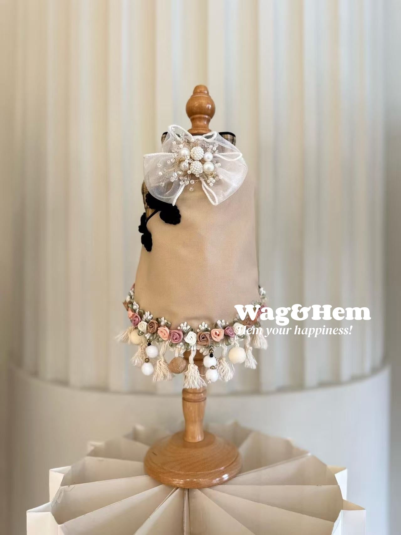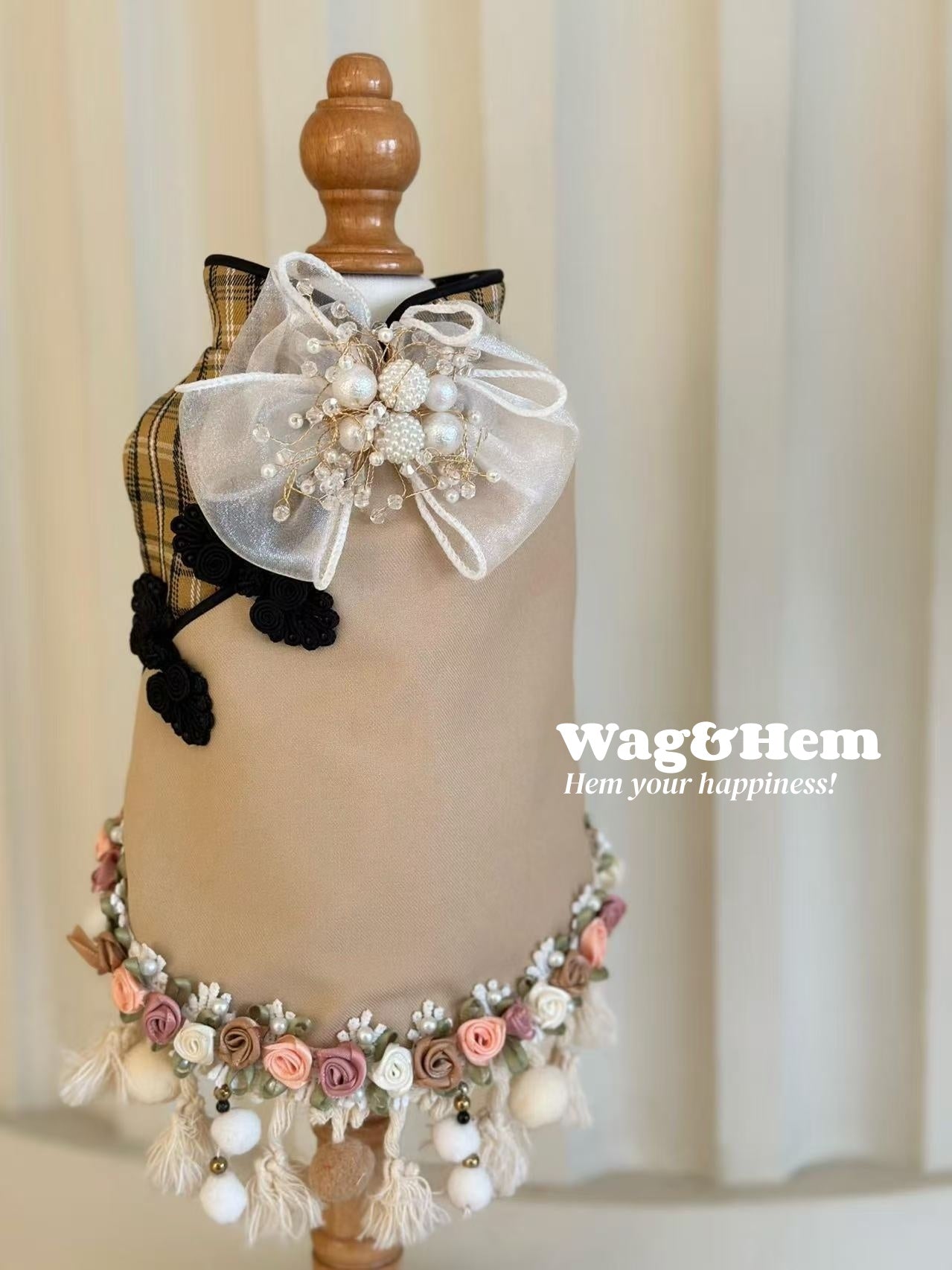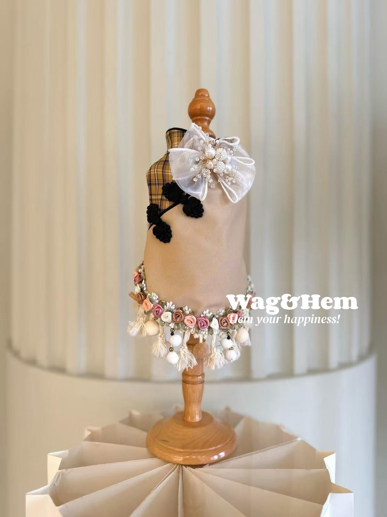 - Основание из атласного ткани цвета хаки, с вставками из клетчатой ткани и черными пуговицами-узлами, украшено вручную сделанным бантом из жемчужной сетки, градиентным объемным венком из цветов и пушистыми кисточками, что тонко сочетает британский винтажный стиль клетчатой ткани с романтичной нежностью цветочных колосьев; клетчатые вставки подчеркивают многослойность, банты из жемчужной сетки изящны как художественные украшения, градиентный венок и пушистые кисточки легко колышутся при движении, создавая образ питомца, словно вышедшего из винтажного журнала — джентльмена или леди, при этом сохраняя изысканность ручной работы высокой моды, легко становясь центром внимания.