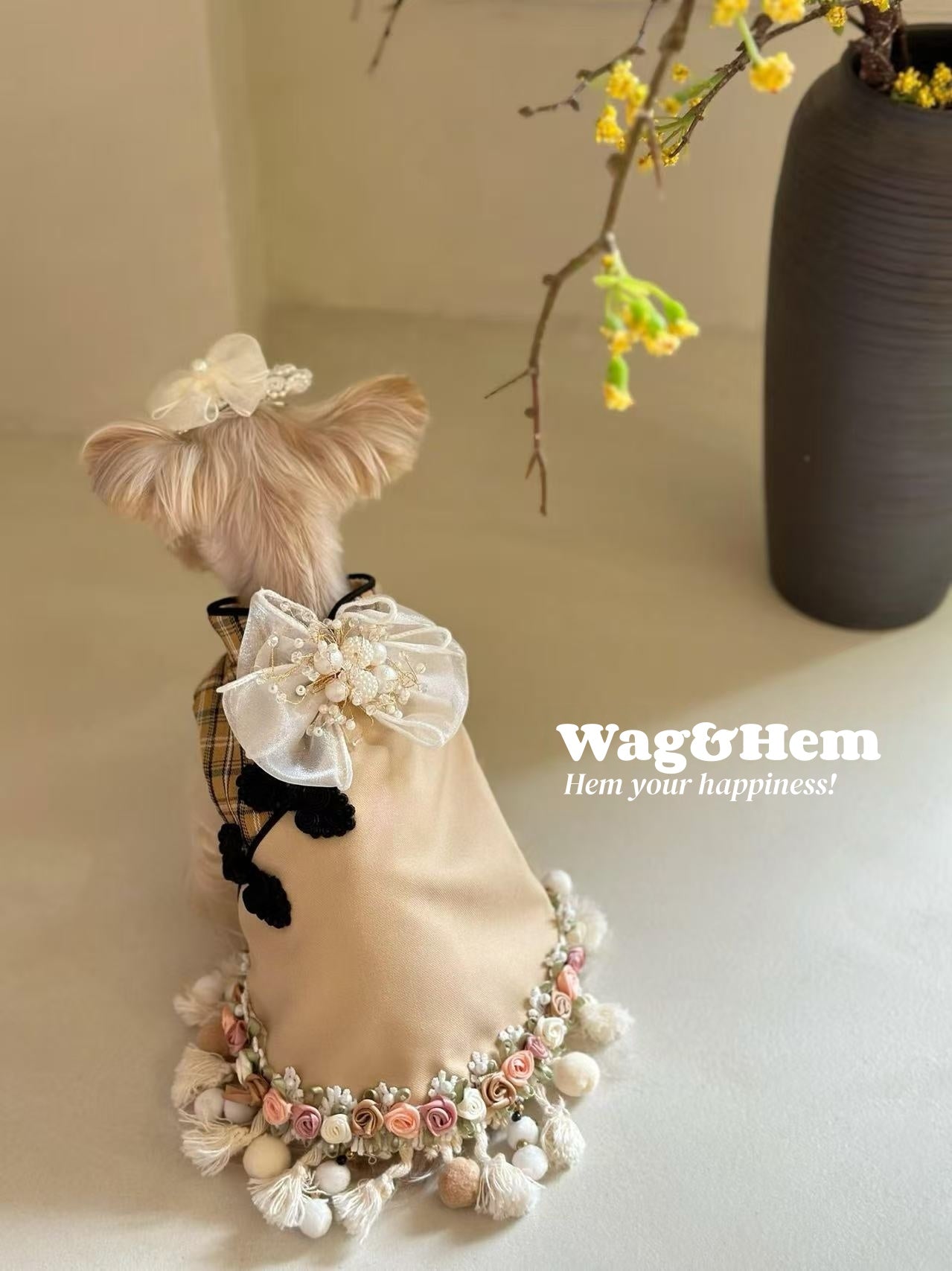 - Венок, кисточки и банты из сетки выполнены вручную, надежно и аккуратно; атлас и клетчатая ткань мягкие и приятные к телу, с хорошей драпировкой; объемный крой плотно облегает тело питомца, цветочные колосья и кисточки подвижны и легко колышутся, не стесняя движений. Поддерживается индивидуальный пошив, будь то винтажная вечеринка, изысканное собрание или модная прогулка — ваш любимец будет излучать винтажную романтику, сочетая красоту и комфорт.