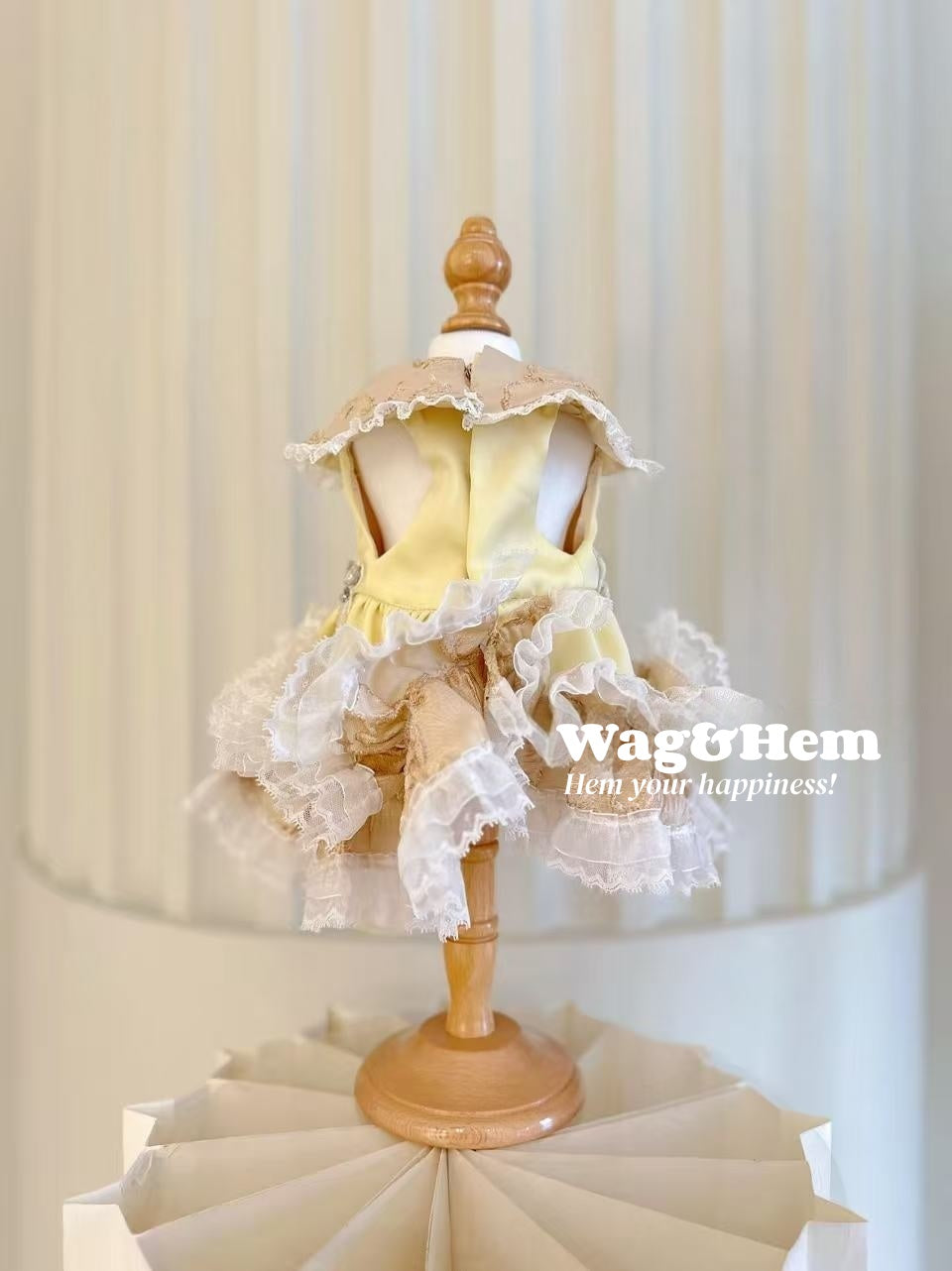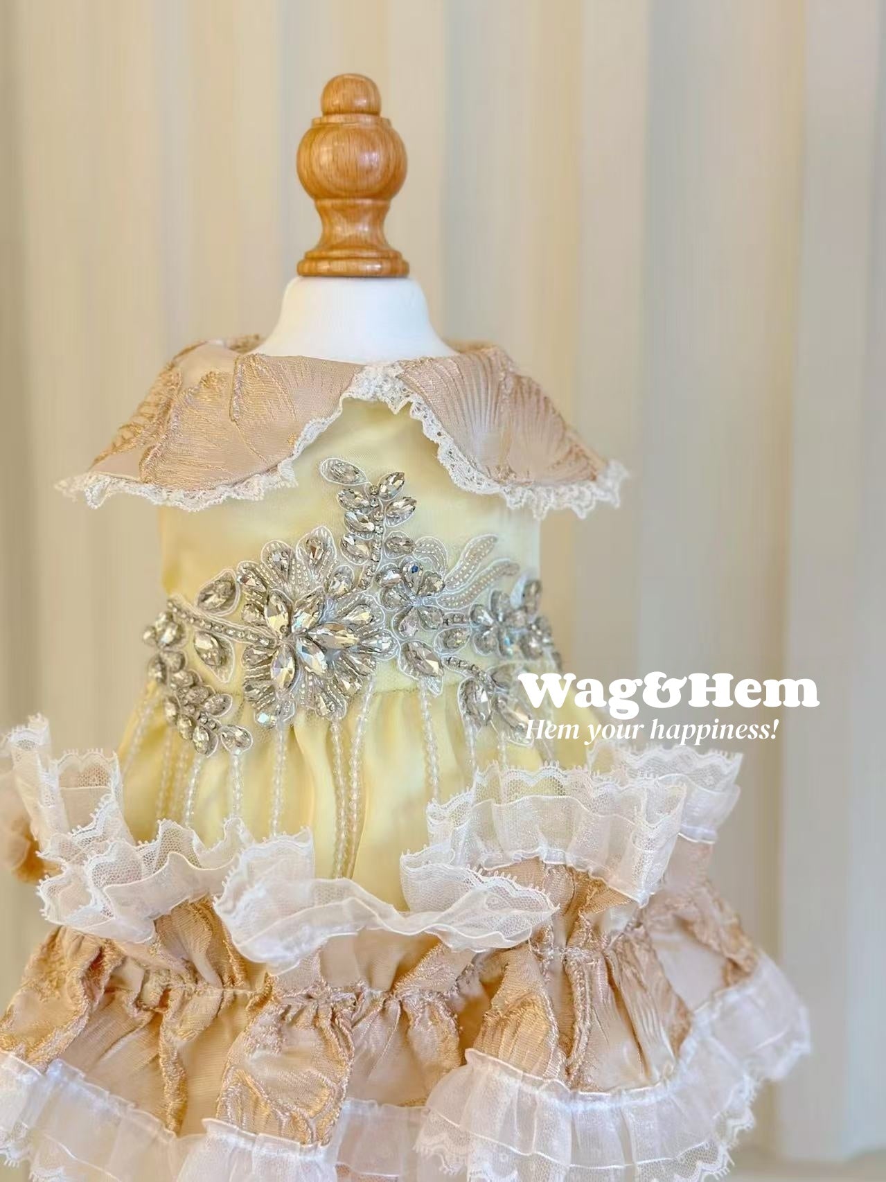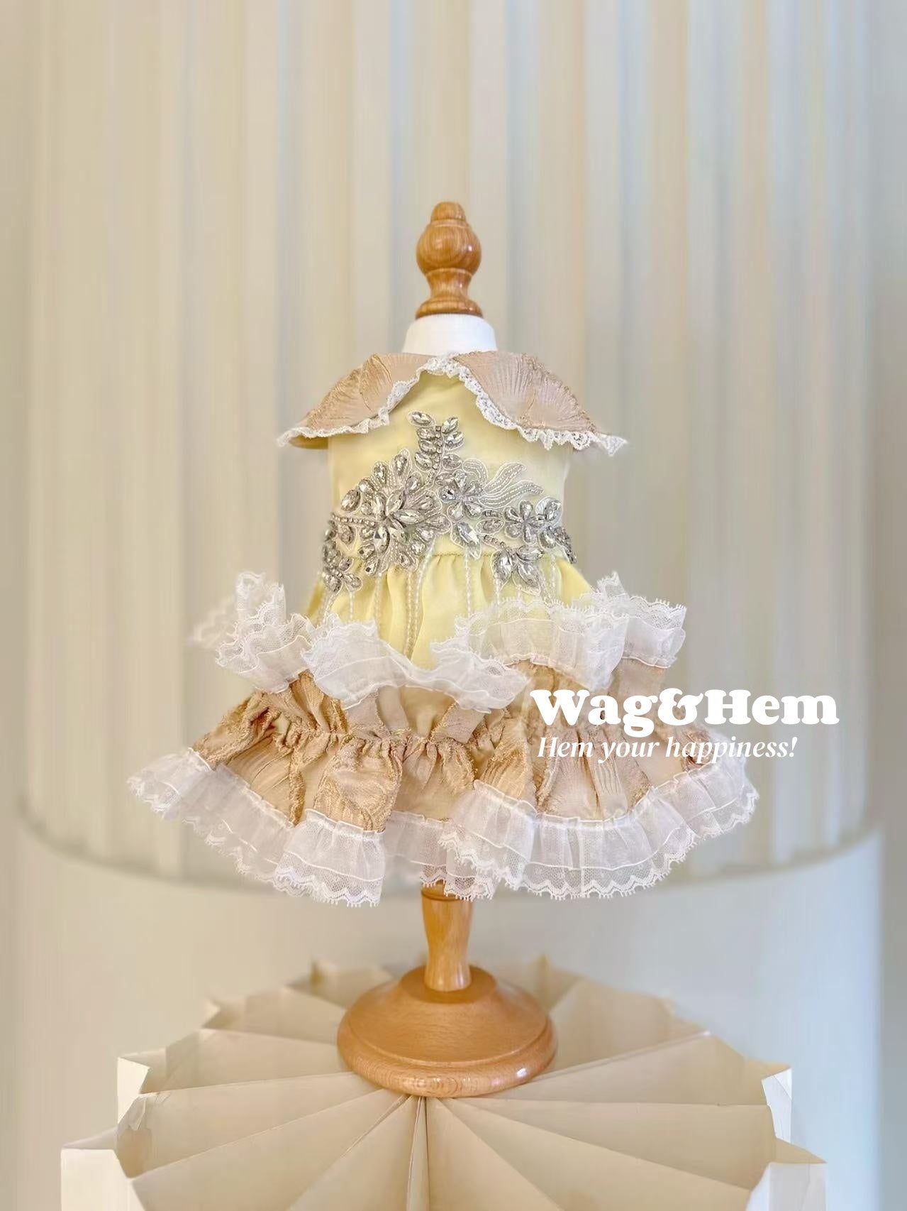 - Основание из мягкого жёлтого атласа, сшитое с воротником из светло-коричневого кружева и многослойными оборками из белой вуали, украшенное вручную инкрустированными стразами в виде цветочных узоров, мастерски сочетает роскошную романтику рококо с блеском высококлассных украшений; узоры из страз тонкие, как кристаллическое рельефное изображение, многослойные кружевные оборки лёгкие, словно облака, мягкий жёлтый оттенок тёплый и изящный, на питомце наряд выглядит как у маленькой аристократии из европейских дворцовых картин, при этом наполнен изысканным качеством ручной работы, легко становясь центром внимания.